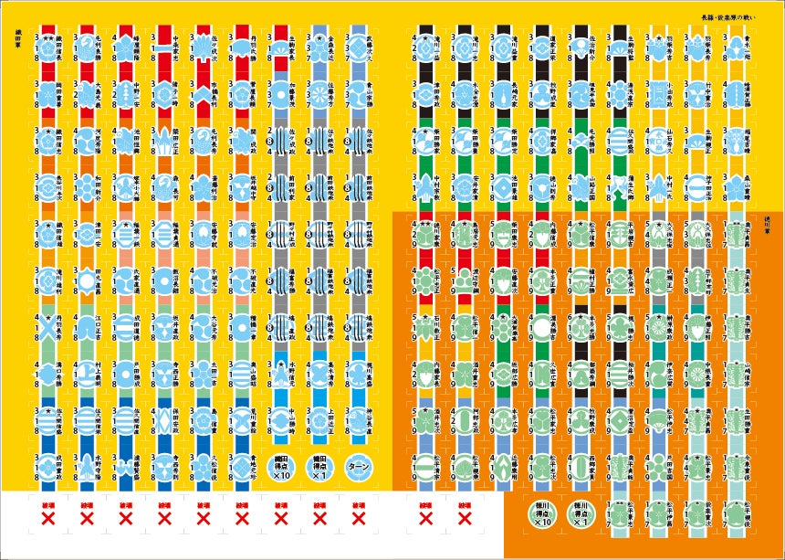 鉄炮衆を除く全てのユニットには、武将名と家紋が入っています。5年以上に渡るリサーチのほとんどは武将と家紋に費やされたといっても過言ではありません。