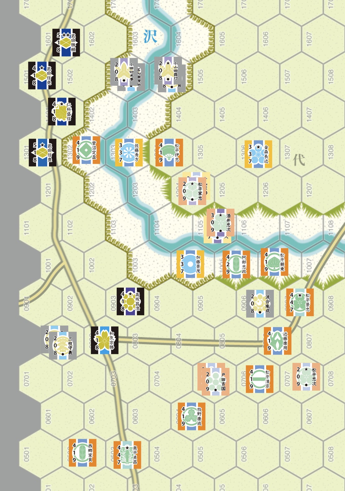 設楽原の戦いに先んじて行われた、徳川・織田分遣隊による鳶ヶ巣砦をはじめとした武田方の砦に対する奇襲戦をテーマとしたシミュレーションゲームです。「決戦、設楽原」よりもユニット数が少ないため、プレイしやすいゲームとなっています。長篠城籠城兵もユニットにしているので、時間が許せば武田の長篠攻城戦もシナリオ化したいと考えています。