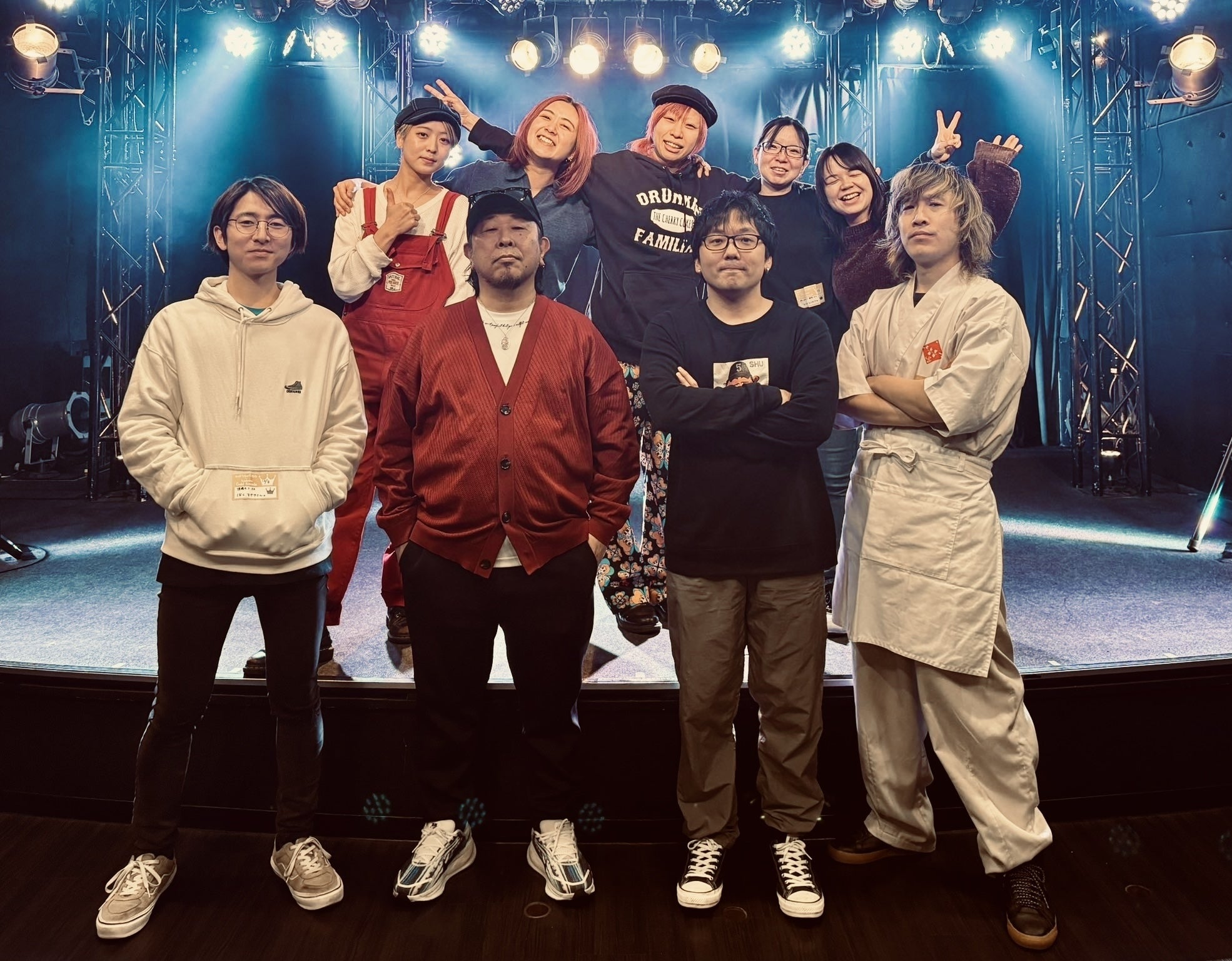 手前左から、杉木(PA/現場チーフ)、SHU(代表取締役)、丸山(店長)、としぞー(ブッキング)