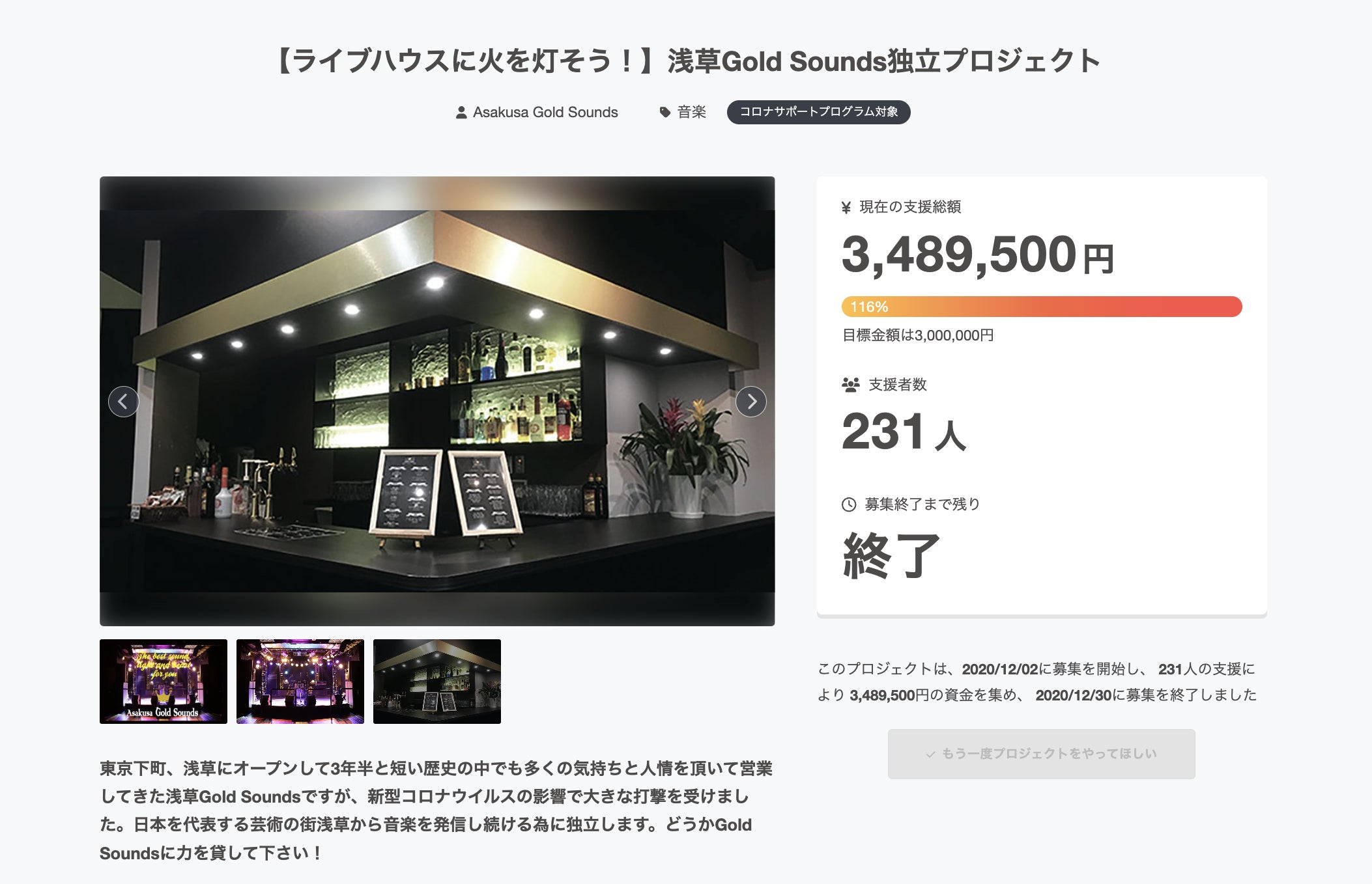 2026/02/25 19:00本日の活動報告は同じ浅草の街を中心に活動し、年月を重ね、現在では、外部イベントでの音響照明の乗り込みなどもさせて頂き、Gold Soundsの音と人を信頼してくれている東京力車さんからホールレンタルプランのご支援とメッセージを頂きましたのでご紹介させて頂きます!**********************東京力車(左から、石橋拓也 白上一成 田井裕一)2017年 仏「JAPAN EXPO」、英「HYPER JAPAN」にて新メンバーによる初ライブ & 海外でのライブデビューを果たし、約1万人を動員。2018年 追加オーディションにて 白上一成、田井裕一がメンバーとなる。その後も三波春夫×東京力車×ヒャダインによる新歌謡ポップス三部作のリリース(いずれもオリコン演歌・歌謡ランキング初登場1位を獲得。)や多くの賞の受賞やテレビなどのメディア出演を果たし、2024年に開催した浅草花劇場でのデビュー5周年コンサートはGold Soundsスタッフも乗り込みサポートし、満員御礼。● Gold Soundsとのこれまでの関わりGold Soundsの皆さんとは、コロナ禍からが本格的なはじまりでした。当初は、オーガナイザーのブッキングアーティストでしかなかったと思います。コロナ禍でライブハウスが大変な時に、浅草という場所で共に頑張っていきたいと思い色々と交流を持ちはじめたのがはじまりだと思います。ライブハウスとはなんぞや?という音の作り方、リハーサルの仕方などを教えていただいたのは間違いなく浅草Gold Soundsです。● 新店舗に関しての想い浅草という人情溢れる場所で“音”を鳴らし続ける浅草Gold Soundsスタッフの皆さんは人情が溢れています。ライブハウスという場所のルールを知らなかった僕達を育ててくれた浅草Gold Sounds。浅草Gold Soundsに訪れた方々が笑顔になってくれるまた、その笑顔の再会を新天地で望んでいます。● 今回のクラウドファンディングで支援したプラン(ホールレンタルプラン)僕らの仲間に新しい浅草Gold Soundsでのライブを観ていただきたい!そして、新しい聖地をみんなで作っていきましょう!**********************東京力車とAsakusa Gold Soundsは、アーティストとライブハウスの関係を超えて、時に、大切なものを共有し、悔しい思いや夢を語り合って、笑い合ってきた仲間です。大事なイベントでの音響照明をGold Soundsに任せてくれること。店を空けて、スタッフ一同でサポートしに行けること。この関係は、誰とでも作り上げられるものではありません。今回のホールレンタルプランを利用したイベントで、新店舗にも東京力車がたくさんの仲間を連れて浅草を賑わせてくれることに心より感謝です。クラウドファンディングは、明後日2月27日に終了となります。本日18時時点で210名の方にご支援いただき、達成率は75%、期間は残り2日間となっております。正真正銘最後のラストスパート。最後まで何卒宜しくお願い致します! もっと見る
