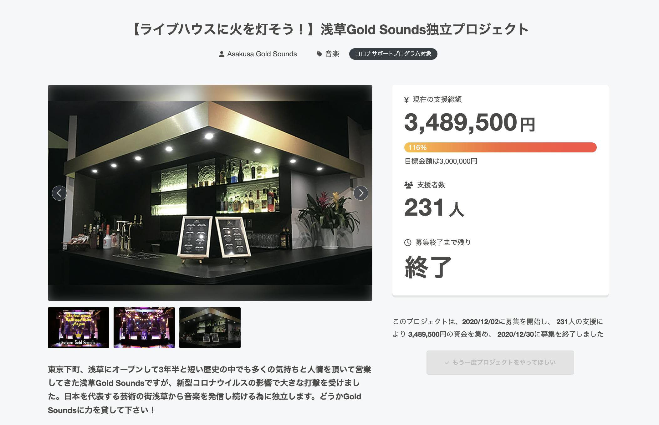 2026/01/28 20:41いつもありがとうございます。Asakusa Gold Soundsの店長の丸山です。ひとまずは無事クラウドファンディングを公開できまして、皆様にたくさんの反応を頂いて、ありがたい限りです。当初のお知らせから随分時間が空いてしまいまして、多くの皆様に見て頂けるのか。ご支援頂けるのか。スタッフ一同、密かに不安に思っておりました。一安心しております。公開したご支援の内容などわかりづらい部分もありますと思いますので、何かご質問やその他要望などありましたら、CAMPFIREのメッセージ上でもSNSでも、気兼ねなくご連絡ください。取り急ぎ、初回の活動報告は、コンピレーションアルバムについてです。アルバムタイトルは、【Human as the Sounds】Gold Soundsの理念である、"人が音、音が人"という言葉を元につけさせて頂きました。音楽は人生であり、人間性は音に出ます。Gold Soundsが素晴らしいライブハウスだと言って頂けるのは、集まる人々が素晴らしい人々だからです。お客様・出演者・イベンター・関係者・スタッフ、Gold Soundsに集まるすべての"人"を繋いできたのは、間違いなくここで鳴ってきたすべての"音"だと思っています。Gold Soundsのいわゆる"ブッキング"で出演するバンドさんのみでなく、イベンターさんのご縁で出演して頂いたバンド/アーティストなど、幅広く、Gold Soundsの9年間を感じられる物になったら良いなと願っています。(本来の形で9周年月間となる二月を迎えられなかった事も非常に悔しいです。)また、皆さんが気になる出演アーティストについては、今回のクラウドファンディングの期間に並行して、参加アーティストを募り、その途中経過を報告していきたいと思っております。(我こそは!というアーティストは、是非ご連絡下さい!)すでにたくさんのアーティストが手を挙げてくださっておりまして、第一弾の発表は2月1日の18:00に行います。ぜひともチェックお願い致します!ご覧いただきありがとうございました。皆様の人生の一部に、これからもGold Soundsが在りますように。Asakusa Gold Sounds スタッフ一同 もっと見る