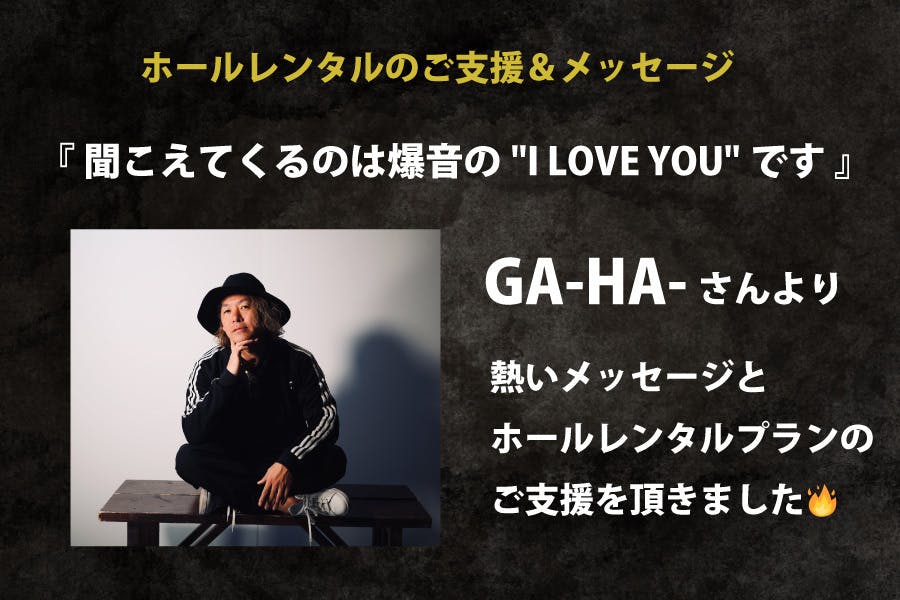 2026/02/18 19:00本日の活動報告は多くのイベントをGoldSoundsで開催して頂いた、GA-HA- さんよりホールレンタルプランのご支援とメッセージを頂きましたのでご紹介させて頂きます!**********************GA-HA-1993年より " えちうら "として活動。メジャーデビューや多くのタイアップを経験後2011年にZepp Tokyo ワンマン公演にて活動終了2013年 GA-HA- / HAZEL による音楽ユニット " TORAfic☆signALL "結成2016年 GA-HA-としてsolo活動開始2018年より、Director/Sound Producerとして本格的に活動開始 ● Gold Soundsとのこれまでの関わりGold Sounds元年より(何なら その前のライブハウスから)イベントオーガナイザーとして出演者としてトータル300本以上のイベントに関わらせて頂いておりました● 新店舗に関しての想い地上では レッテル、罵詈雑言が我々の心を蝕み"ノイズ"として鳴り響く中電波も届かないその代わりにそんなノイズも届かないGoldsoundsはライブハウスはまるで"シェルター"のようにボクらを守ってくれていたように思います聞こえてくるのは爆音の"I LOVE YOU"ですそんなGold Soundsの帰り道地上に再び戻りノイズの代わりに音符だらけの幸せな耳鳴りにして家まで送り届けてくれるそんな場所がボクの好きなLIVE HOUSEですGold Soundsですもう、いつの間にか大人というものにもなってしまったので自分の大切な場所くらい 自分で手を差し伸べれる背中を見せていたい所存ですまた それぞれ色で金ピカに人生が鳴る場所Goldsounds会いましょう● 今回のクラウドファンディングで支援したプラン(ホールレンタルプラン)Goldsoundsで300本以上イベントを切ってきたイベントオーガナイザーらしくホールレンタルプラン にさせていただきました今フワッと思ってることは新しくなったGoldsoundsさんにまずは沢山の方が触れてもらう機会をと思うのでこちらで支援させて頂いたホールレンタル券で入場無料にて会場内投げ銭ライブを実施できたらと考えてます!!告知された際には是非遊びにきてください♪**********************今回、GA-HA-さんよりご支援いただいたプランで開催されるイベントはAsakusa Gold Soundsの新店舗の柿落としイベントの一環として開催予定です。今回のクラファンで支援いただいたTシャツを着て頂いたり、壁に掲示された名入れプレートご支援いただいた皆様の集まる機会になりますと嬉しく思います。イベントの詳細は新店舗の物件が決まり次第また追って告知致しますので、発表をお待ちください。本日0時時点で、117名の方にご支援いただき、達成率は43%、期間は、残り9日間となっております。(2/27まで)引き続き、ご支援、拡散のご協力宜しくお願い致します! もっと見る