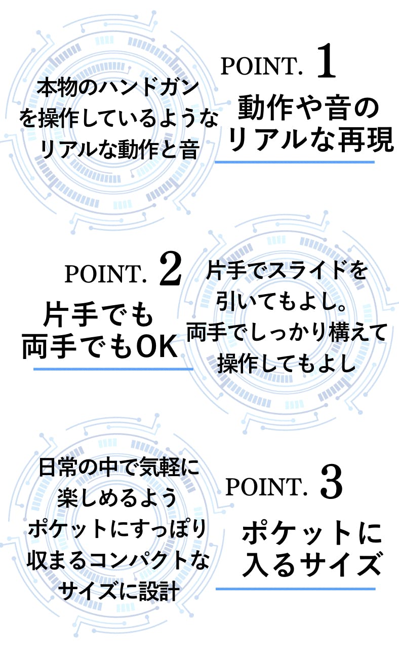 リアル体験を強調動作とサウンドのリアルさによって、本物のハンドガンを扱っているかのような臨場感を体験。手にするたびにリロードの爽快感がよみがえります。