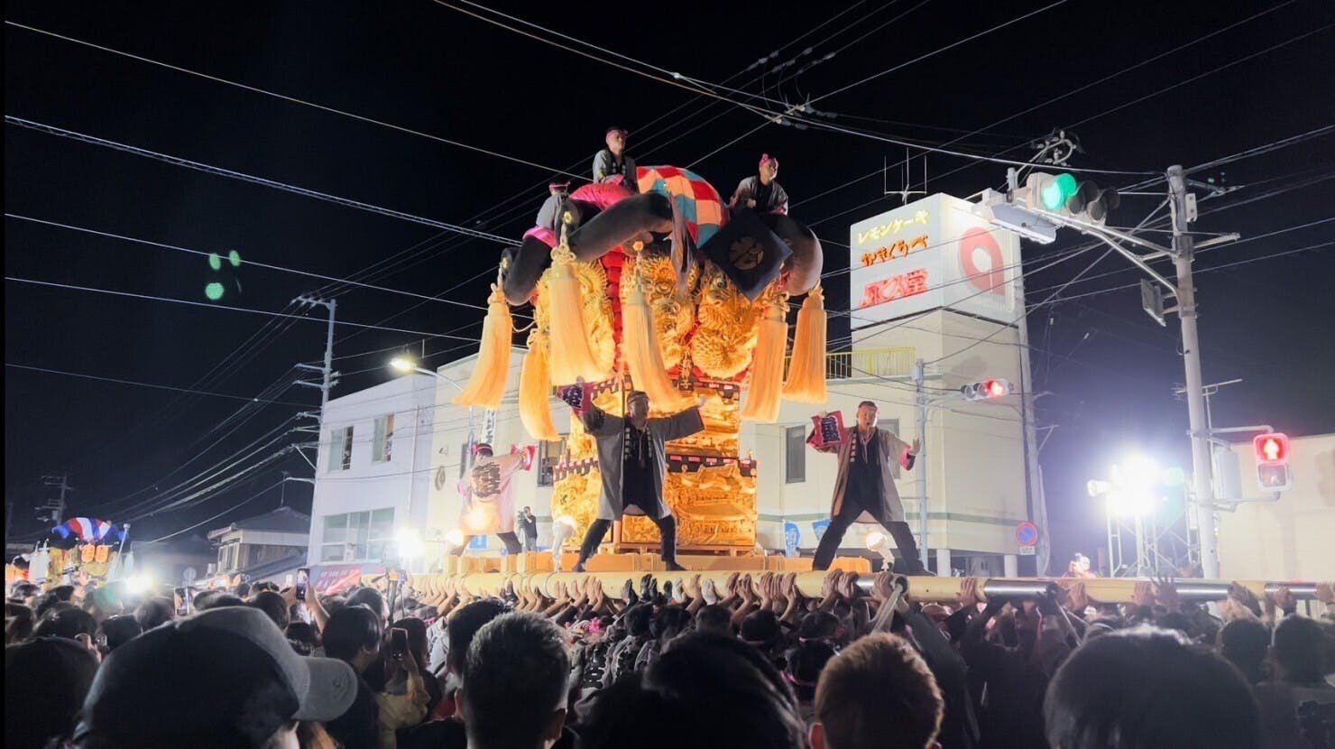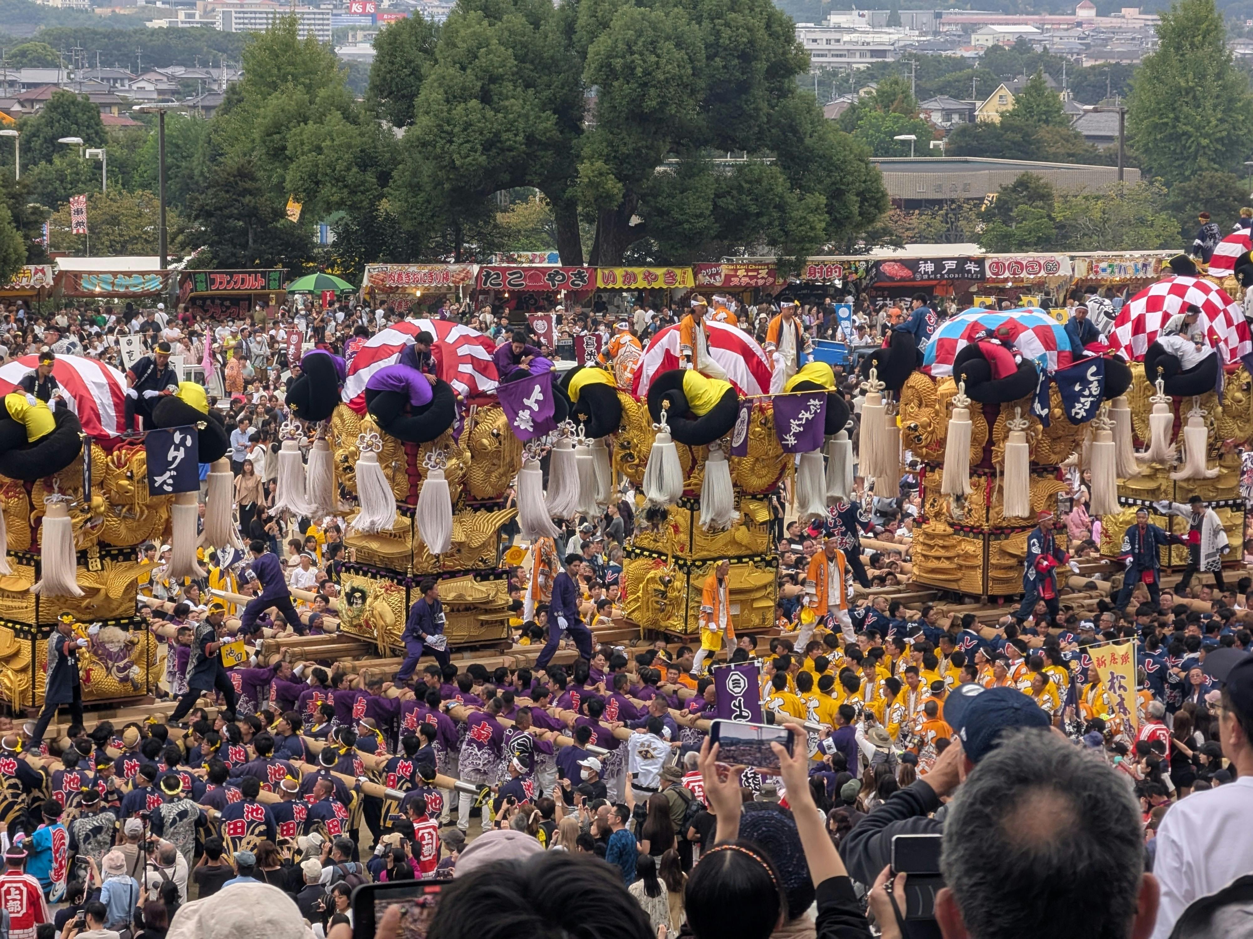 毎年10月に開催されるこの祭りでは、高さ約6m・全長12m・重さ2tにもなる絢爛豪華な太鼓台(たいこだい)が、市内54台も登場し、町を練り歩きます。太鼓台の装飾は金糸銀糸の刺繍で仕上げられ、昼間の迫力、夜間ライトアップの幻想的な雰囲気は、まさに圧巻。