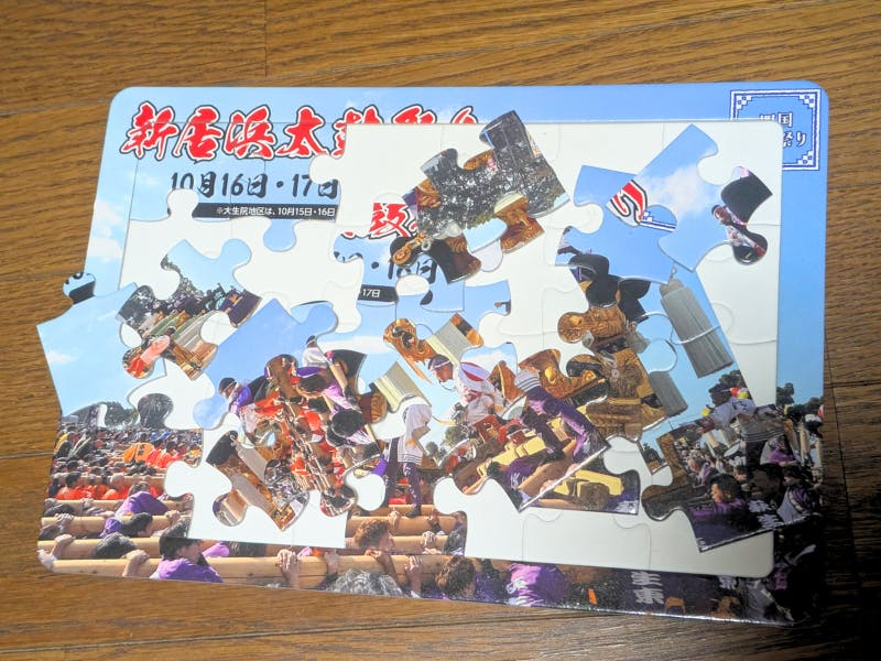 実際に施設・園へ配布支援予定の、新居浜太鼓祭りの写真を使った知育用ジグソーパズル1セット(A4サイズ・24ピース)+施設・園への配布支援証明書