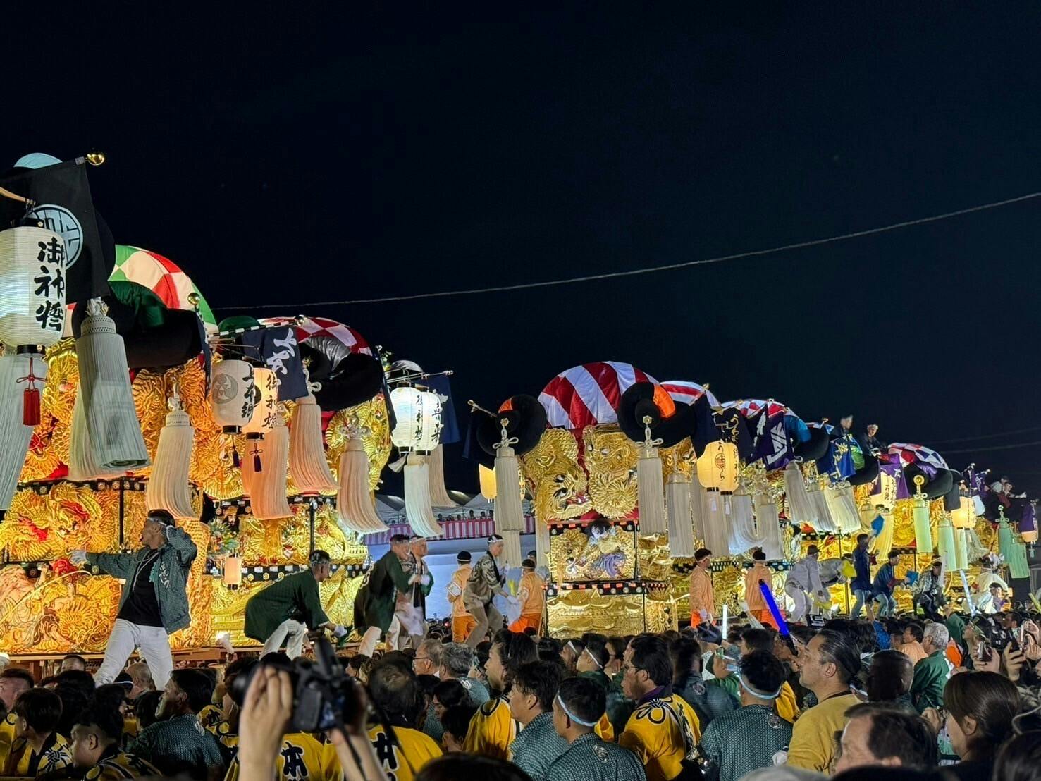 毎年10月に開催されるこの祭りでは、高さ約6m・全長12m・重さ2tにもなる絢爛豪華な太鼓台(たいこだい)が、市内54台も登場し、町を練り歩きます。太鼓台の装飾は金糸銀糸の刺繍で仕上げられ、昼間の迫力、夜間ライトアップの幻想的な雰囲気は、まさに圧巻。