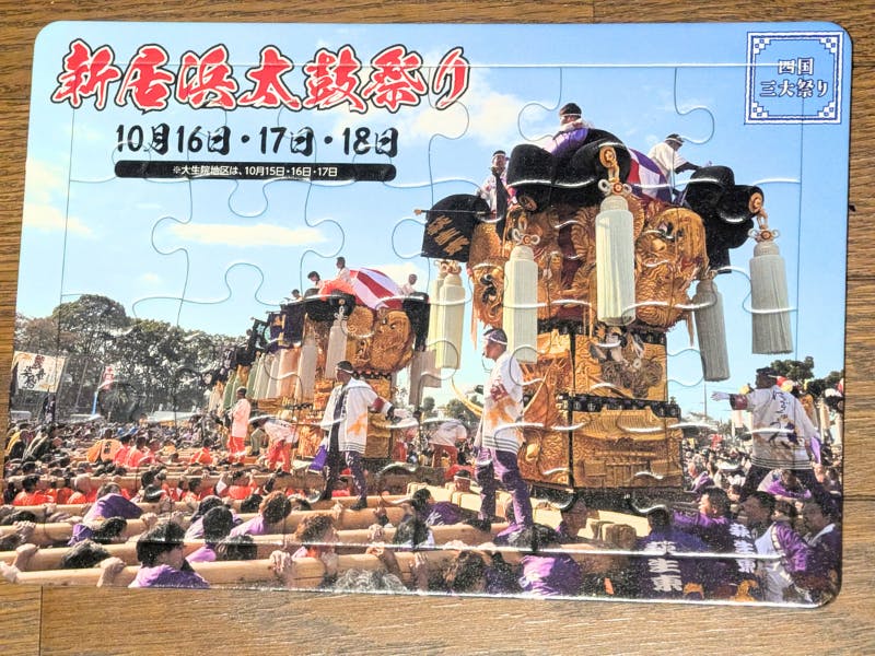 実際に施設・園へ配布支援予定の、新居浜太鼓祭りの写真を使った知育用ジグソーパズル1セット(A4サイズ・24ピース)+施設・園への配布支援証明書