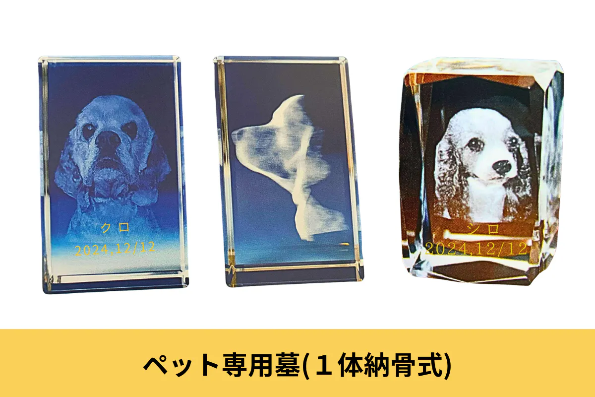 クリスタル製の墓内部に3Dで180%立体レーザー彫刻を施した1体納骨式ペット墓です。