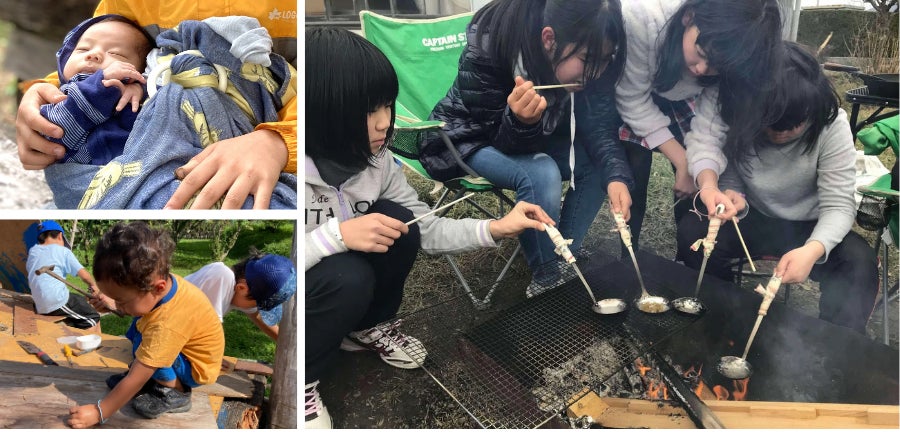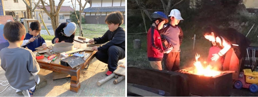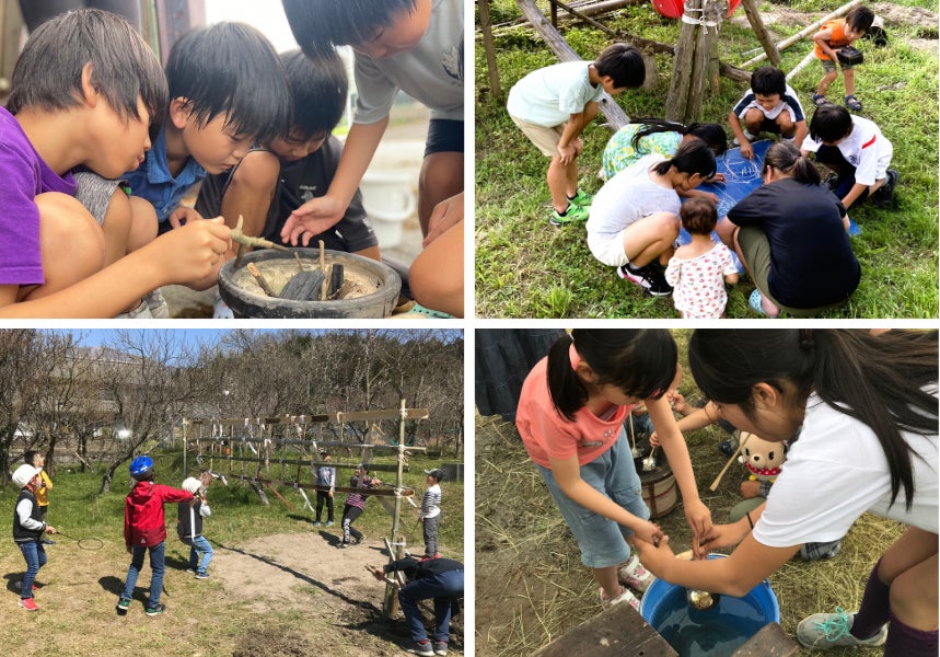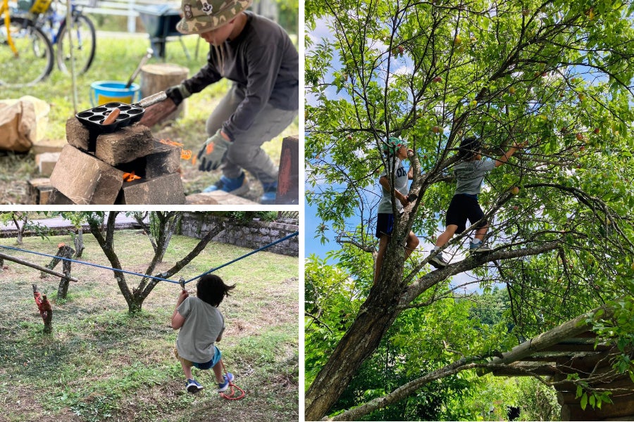 たき火、木登り、工作、ロープ遊具作りに鬼ごっこ。自然豊かな米原ならではの、子どもたちの自由で幸せな時間。