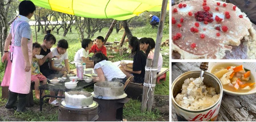 子ども食堂も野外で。羽釜で炊いたご飯やスープを空の下でいただきます。