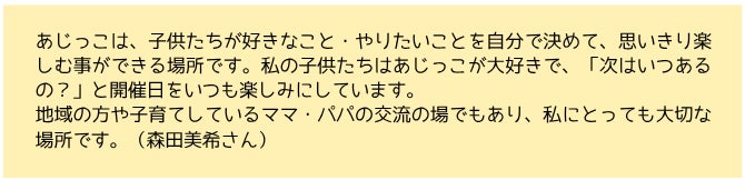お子さんの姿を重ねて、お孫さんの未来を思い浮かべて、近所の子どもたちを思って、そして、ご自身の子ども時代を重ねて、お一人おひとりが「我がこと」としてあじっこパークを思ってくださいました。