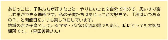 あじっこパークの世話人代表である私自身も3児の母。 東京で働きながら子育てを始めた頃にプレーパークの存在を知りました。