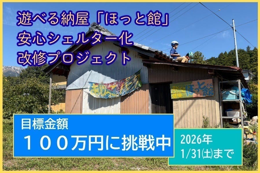 滋賀県米原市のプレーパーク「冒険遊び場あじっこパーク」です。猛暑・厳寒でも安心して外遊びができるように、子どもの遊び場・子ども食堂の拠点の納屋を改修し、安全に過ごせるシェルターにしたい!