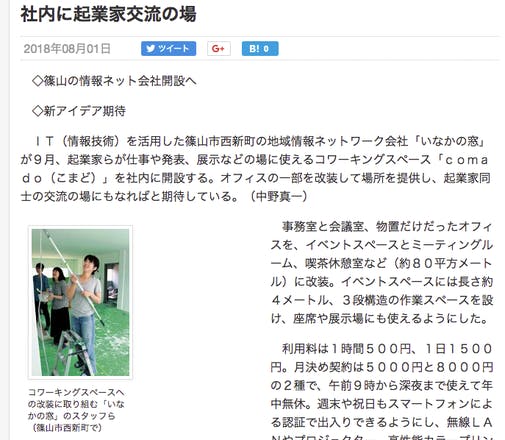 2018/08/01 19:242018年08月01日読売新聞紙面及びWEB版にてコワーキングスペースについて掲載いただきました! 「IT(情報技術)を活用した篠山市西新町の地域情報ネットワーク会社「いなかの窓」が9月、起業家らが仕事や発表、展示などの場に使えるコワーキングスペース「comado(こまど)」を社内に開設する。オフィスの一部を改装して場所を提供し、起業家同士の交流の場にもなればと期待している。(中野真一)」 続きはこちら→https://www.yomiuri.co.jp/local/hyogo/news/20180731-OYTNT50210.html 改装しているところを写真撮影いただき、素敵な記事にしてくださいました! スタッフ田代の思いやコワーキングの設備についても詳しく記載してくださいました! *取材時の写真撮影風景 より一層がんばっていきたいと思います! もっと見る