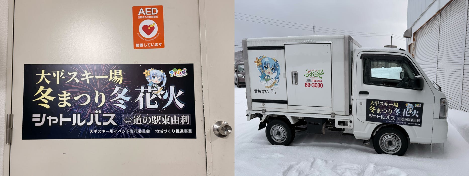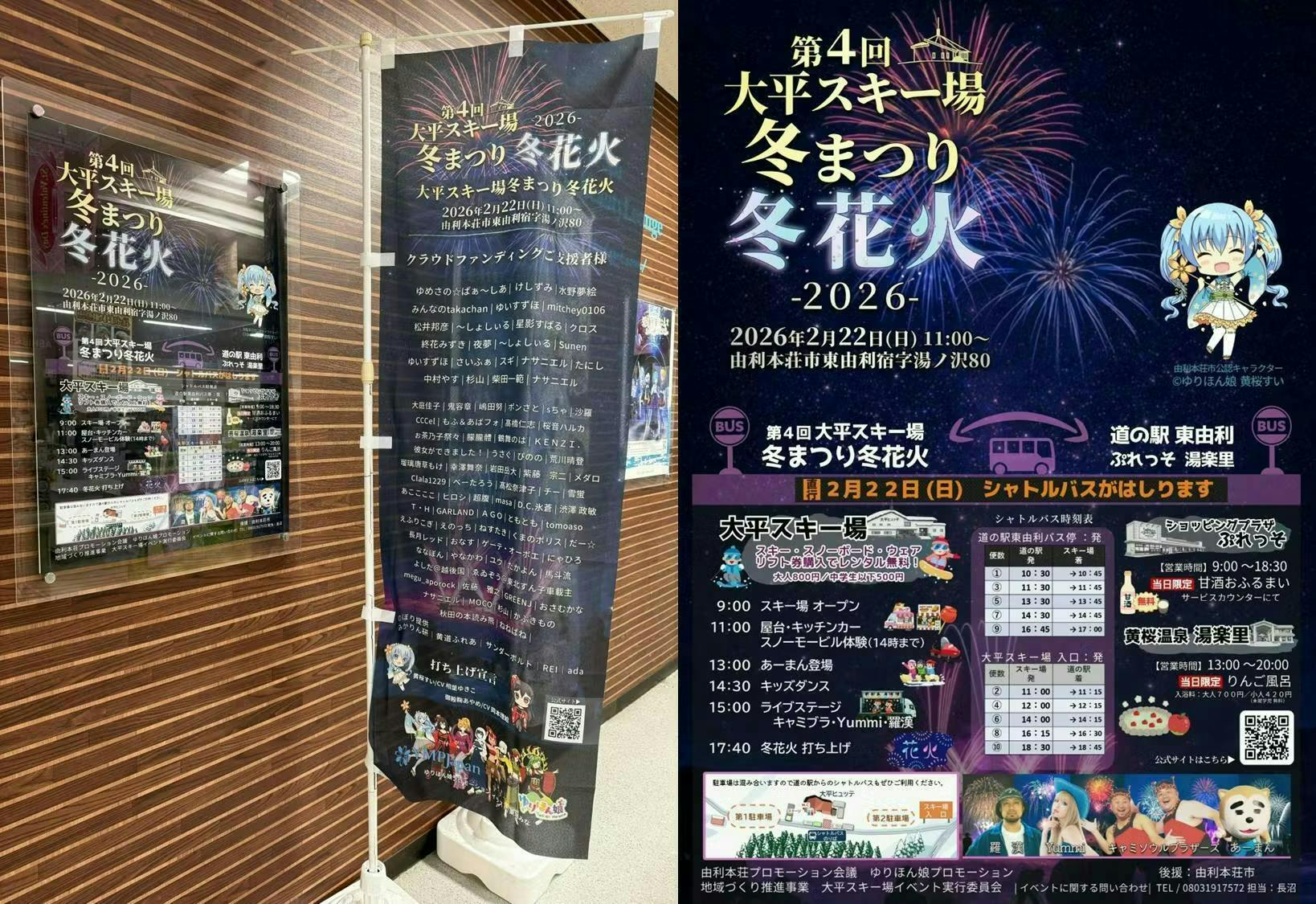 ポスター・フライヤーは、大平スキー場・黄桜温泉湯楽里・ふれあいプラザぷれっそ・東由利総合支所・麺屋新月・東由利小、中学校などに設置します。