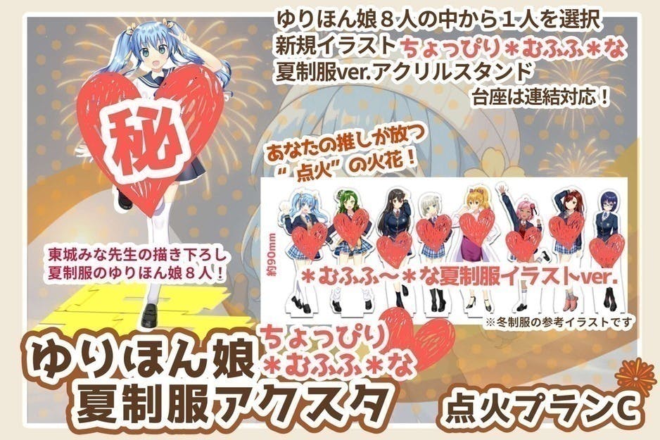 今回は花火だけでなく、夏へと希望をつなぐプロジェクトも。人気イラストレーター・東城みな先生による「ゆりほん娘 夏制服バージョン」の新規イラストを制作します。