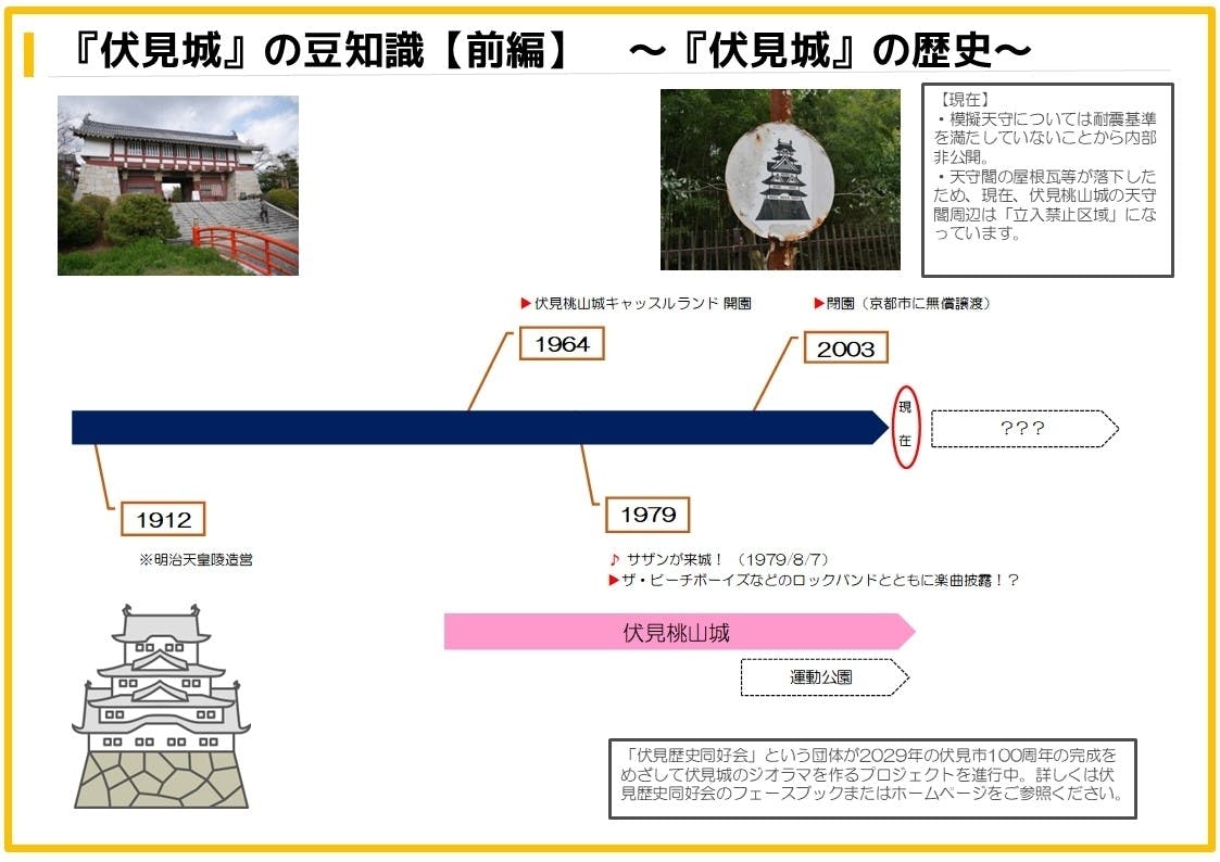 伏見でボランティアとして活動している「伏見歴史同行会」という団体があります。この団体は、伏見市100周年(2029年)を目指して、伏見城のジオラマを作るプロジェクト立ち上げています!興味のある方は、ぜひ「伏見歴史同行会」のホームページをご覧ください。