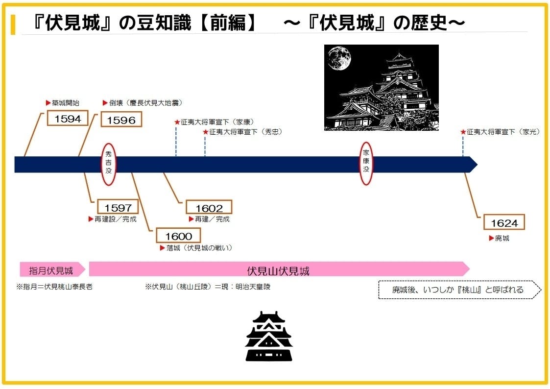 2026/01/12 15:00リターンの御城印『伏見城』。そもそも何故、豊臣秀吉と徳川家康の2代武将が関係しているのか、ご存じですか!?今回は、少しそのあたりを説明します。◆指月伏見城最初の伏見城は、豊臣秀吉が築城した「指月伏見城」(1594年)です。「指月」とは、現在の桃山泰長老町あたりで、指月の丘と呼ばれていました。しかし、1596年に伏見大地震で倒壊してしまいました。◆伏見山伏見城伏見大地震での倒壊後、直ちに再建され、1597年に「伏見山伏見城」が完成しました。「伏見山」とは、現在の明治天皇陵のある場所です。しかし、その翌年1598年に、ここ伏見城で豊臣秀吉が亡くなります。その後、徳川家康が伏見城に入場し、政権掌握への基盤を作っていきます。 ところが、関ヶ原の合戦の前哨戦「伏見城の戦い」(1600年)で、この伏見城は落城してしまいます。伏見の町は、当時の政都であったため、家康は急ピッチで伏見城を再建し、1602年に完成します。◆江戸幕府のスタートを切った伏見城その後、徳川家康は、ここ伏見城で征夷大将軍の宣下を受けます(1603年)。程なくして、家康から秀忠に政権が移ります。1605年に、ここ伏見城で、秀忠の征夷大将軍の宣下が行われました。家康は、大阪の陣で豊臣政権を滅ぼしたあと、1616年に亡くなりました。その後、家光の時代に、ここ伏見城で征夷大将軍の宣下を受けた後、政都としての役割を終えた伏見城は、1624年に廃城されます。伏見城が亡くなった後、いつしか桃木が植えられたことにより、この地は「桃山」と呼ばれるようになりました。そんな経緯で、秀吉と家康の2大武将が関係している!という訳です☆《参考情報》▶ 『伏見城』の豆知識【前編】 もっと見る
