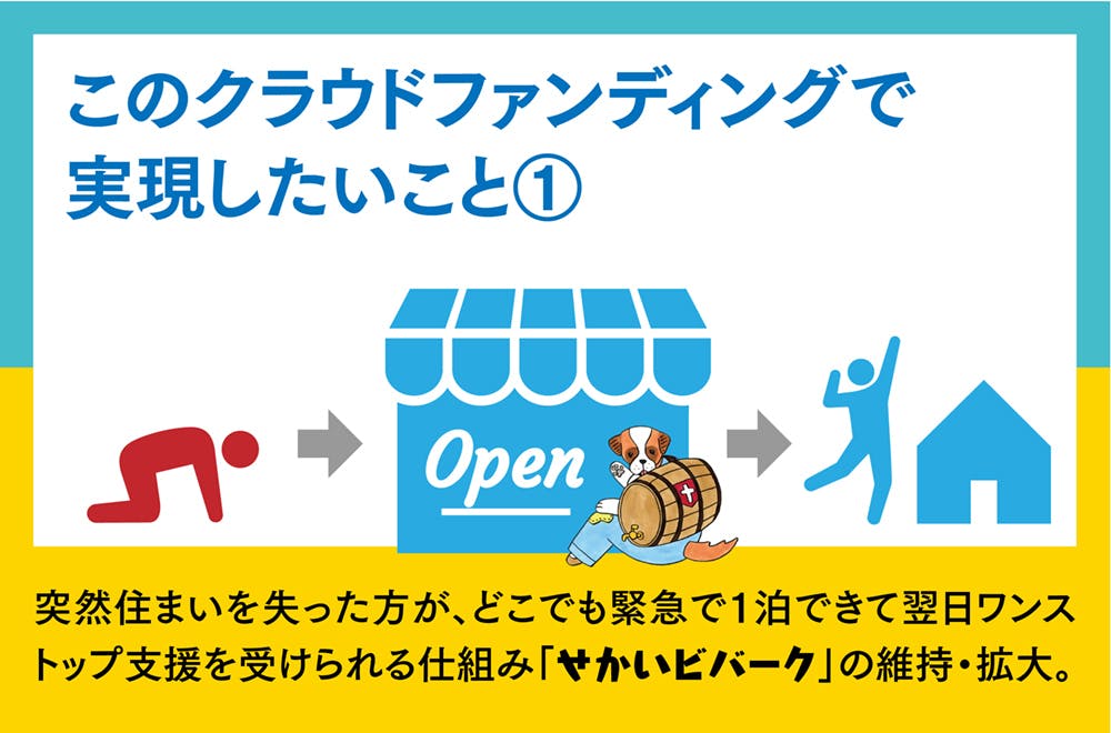 そうして生まれ、2021年から現在も続けているのが、緊急支援プログラム「せかいビバーク」。市民とICTの力で、街のあちこちに緊急の支援ポイントをつくり、助けが必要な人をワンストップで支えるネットワークです。今回のクラウドファンディングで実現したいことのひとつは、この「せかいビバーク」のさらなる拡大です。