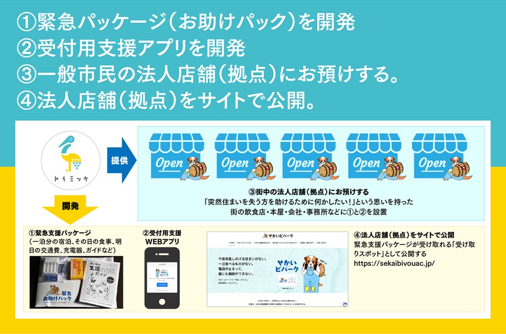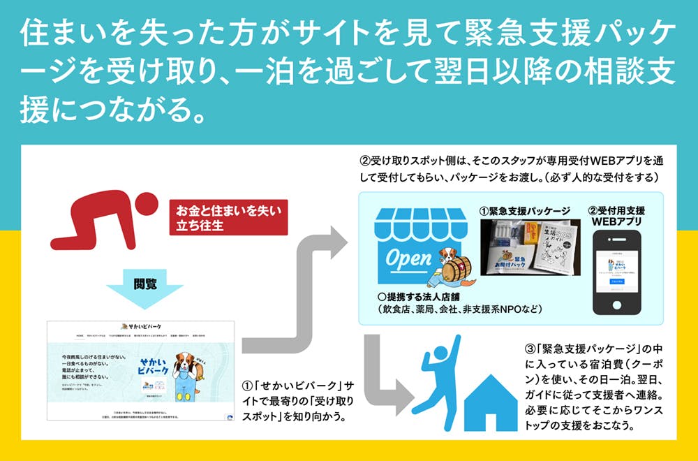 その日、住まいを失って行き場がなくなった方がそのスポットにたどり着くと、店舗や施設のスタッフが受付用相談アプリで簡単な登録を行い、パッケージをお渡しします。受け取った方はその中身を使って、その夜をなんとか安全に過ごすことができます。翌日以降は、私たちのほうで公的支援などにつながるワンストップの支援体制につなげていきます。