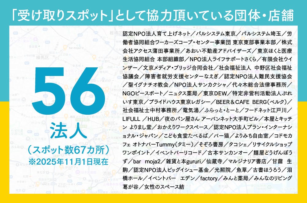 この受け取りスポットは、2025年現在、56法人と連携し、東京都内20区から埼玉までのエリアに計67カ所(移転作業中につき非公開の1カ所を含む)設置しています。営業時間は場所によって異なりますが、深夜2時すぎまで開いているところもあり、実際に深夜の時間帯に駆け込まれたケースもあります。