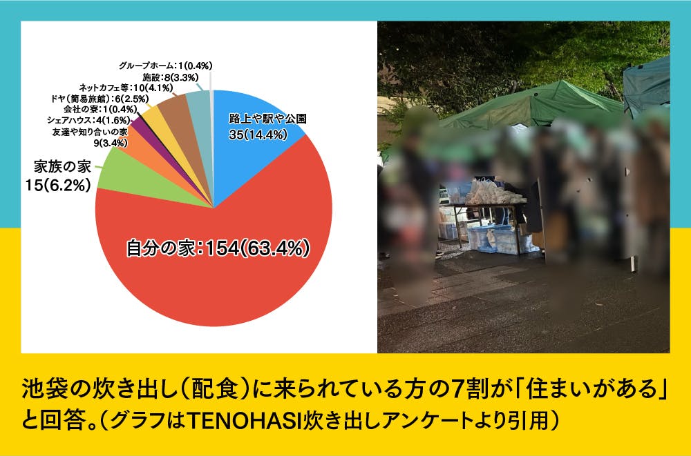 都内では、炊き出し(野外での食料配布)に数百人が並ぶ様子が報じられています。実際、池袋で長年活動しているNPO法人TENOHASIでは、1回の炊き出しで500人規模以上の方が並ぶ日もあります。