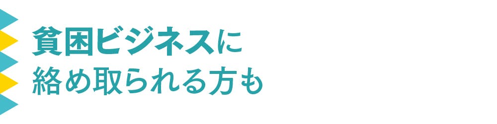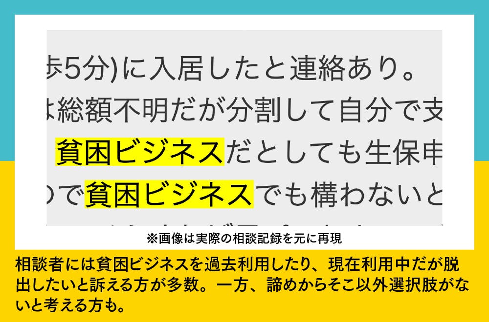 公的支援にも民間支援にも頼れず(頼ることができず)、たった独りで「なんとか頑張っている」状態に置かれている彼ら。その自助努力につけ込まれ、「安く住まいを紹介します」「スマホを用意します」といった甘い誘い文句にのったばかりに、結果的にお金を失ったり、いわゆる貧困ビジネスと呼ばれる搾取や詐欺の被害にあったという声も少なくありません。