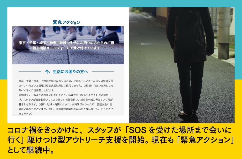 そして何より重要なのは、そうした人たちには「相談にのる」だけでは足りない、ということです。その場で「今夜泊まれる場所」や「すぐに食べられるもの」を手当てする即時の支援が必要になります。
