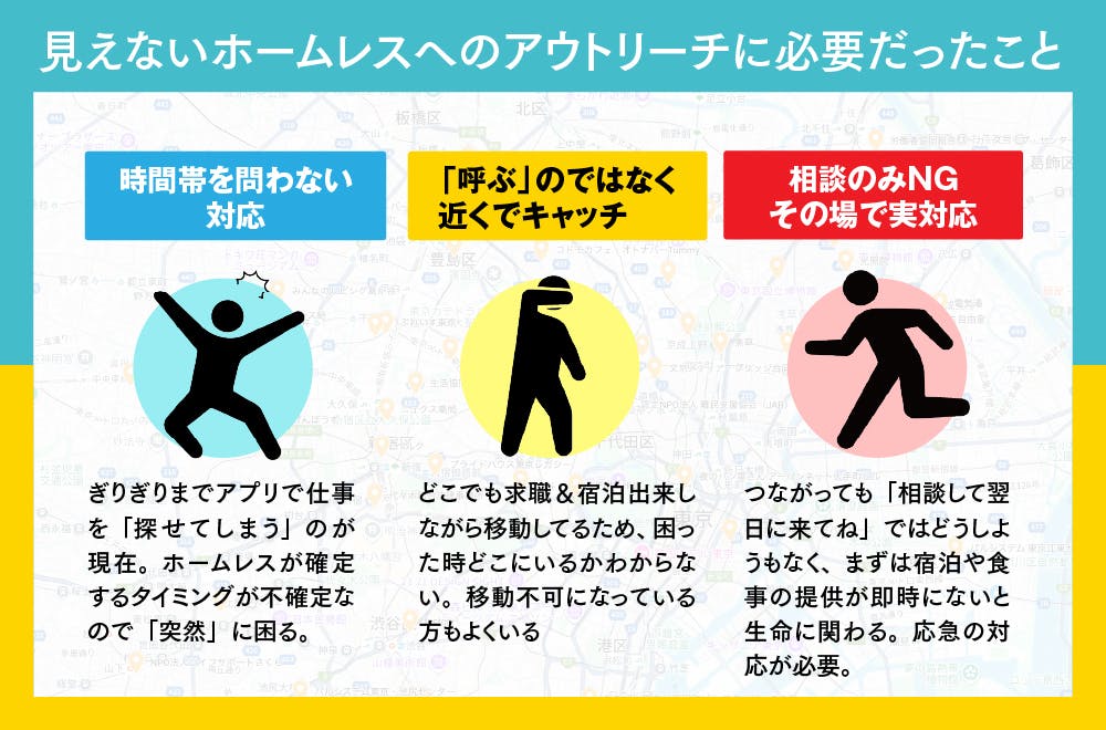 未成年の若者や女性、劣悪な労働環境から逃れてきた方、自分では望まない依存症に苦しむ方など、本当にさまざまな事情を抱えた人たちと、最前線のアウトリーチとして直接つながることができました。