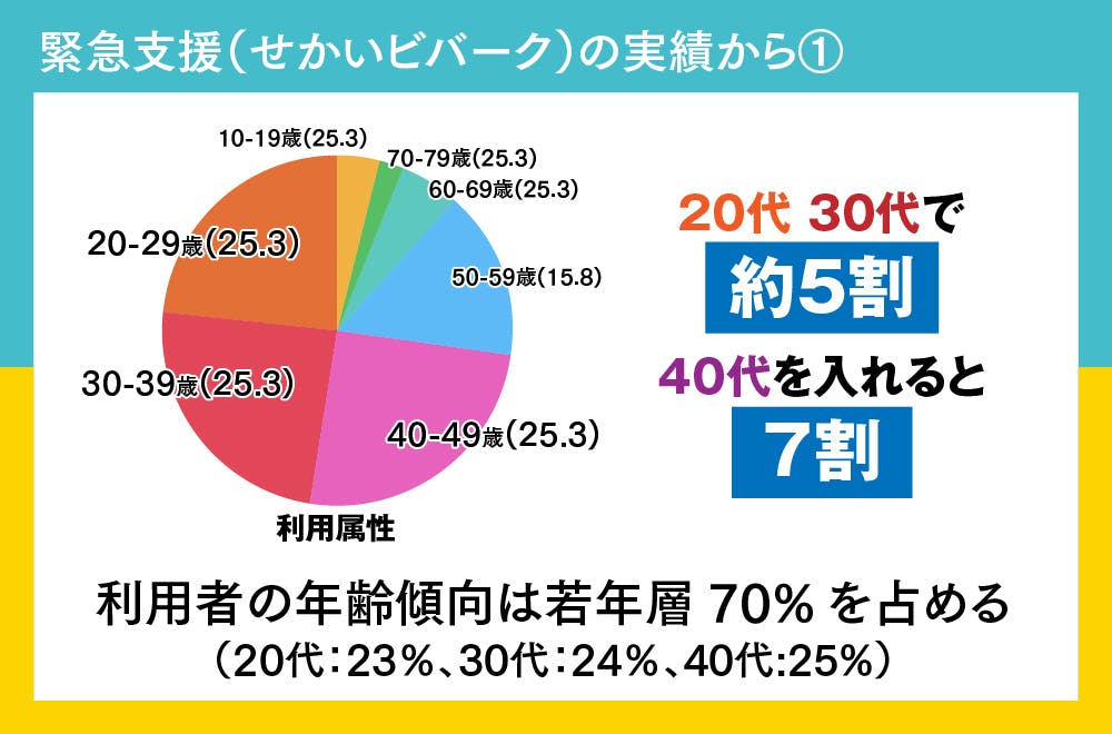 少し話が前後しますが、こうした私たちのアウトリーチ(後述する施策も含む)で出会った「見えないホームレス」は若い世代が多いという特徴があります。2024年度につながった方のうち、20代・30代が全体の5割、40代まで含めると7割に達しています。