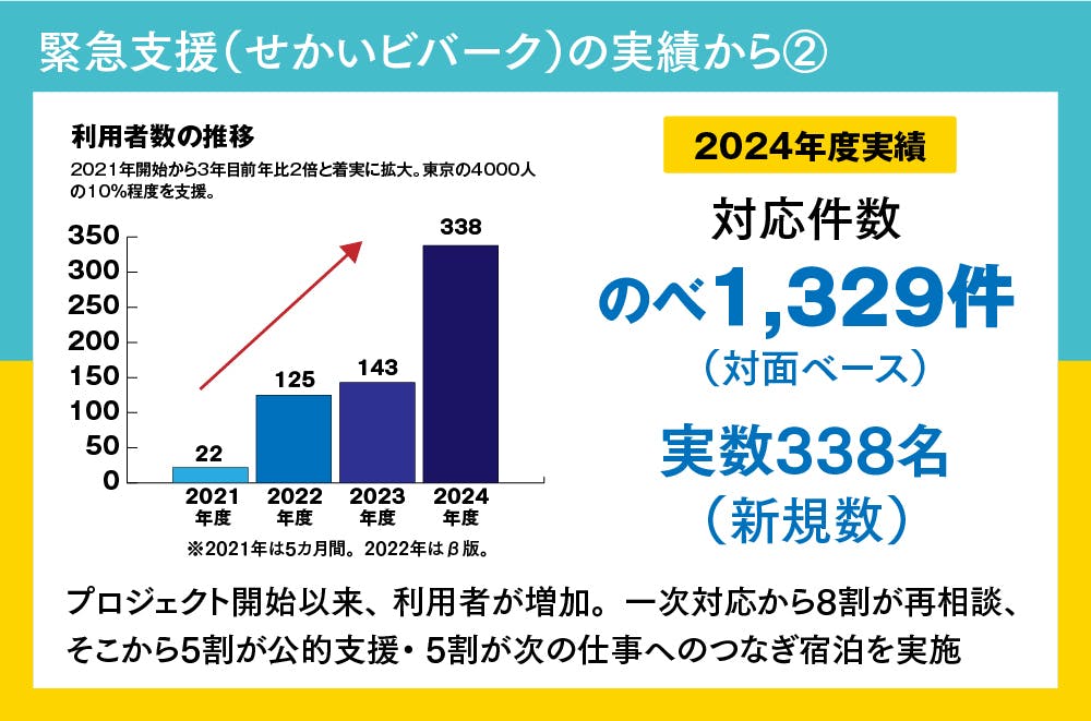 開始当初から想定どおりニーズは非常に高く、多くの方々のご協力のおかげで、利用者は増え続けました。新規受付の一時休止に入る2025年7月まで、一日も休むことなく支援を続けた結果、2024年度は延べ1,329件の相談に対応し、実人数で388人の「住まいを失った方」とつながることができました。(7月以降も継続支援は休まず対応)