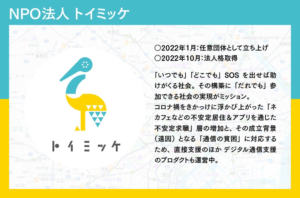 せかいビバークは2021年10月に「一般社団法人つくろい東京ファンド」内の事業として私(佐々木)が立ち上げ、2022年10月のNPO法人トイミッケ設立以降は、つくろいが事業主体・トイミッケがシステム管理を担うかたちでの共同プロジェクトとして運営してきました。