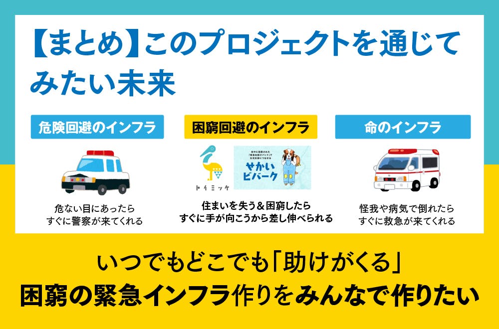 私たちは近い未来、「警察」や「救急」と並ぶ第三のセーフティとして、居場所を失っても「今すぐ」助けにつながる仕組みを社会に実装したいと考えています。単なる理想論ではなく、どの立場の人でも、「いつでも」「どこでも」SOSを出せば、本当に支援の手が届く社会をつくりたいのです。