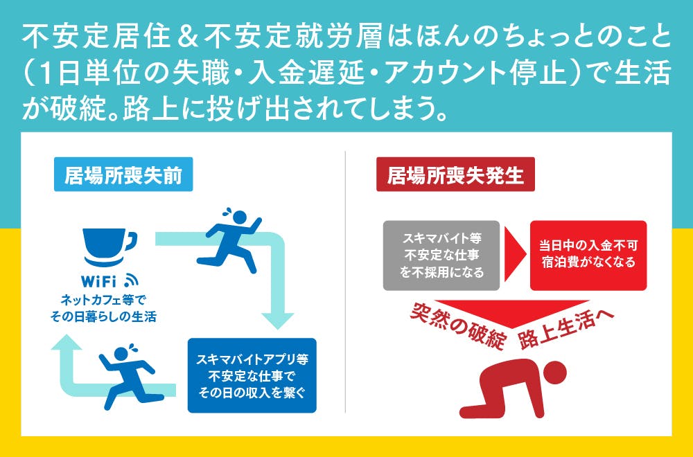 不利な条件のまま社会に出て、挽回する機会がないまま住まいを失うと、その後は「現状維持だけで手一杯」という状態に追い込まれます。そこから自力だけで抜け出すことは容易なことではありません。