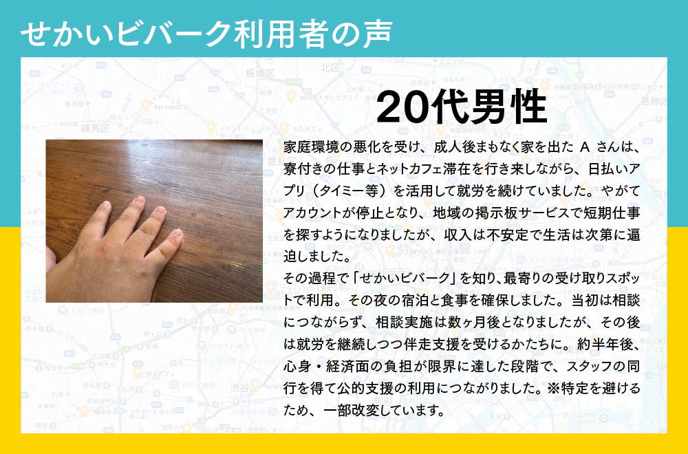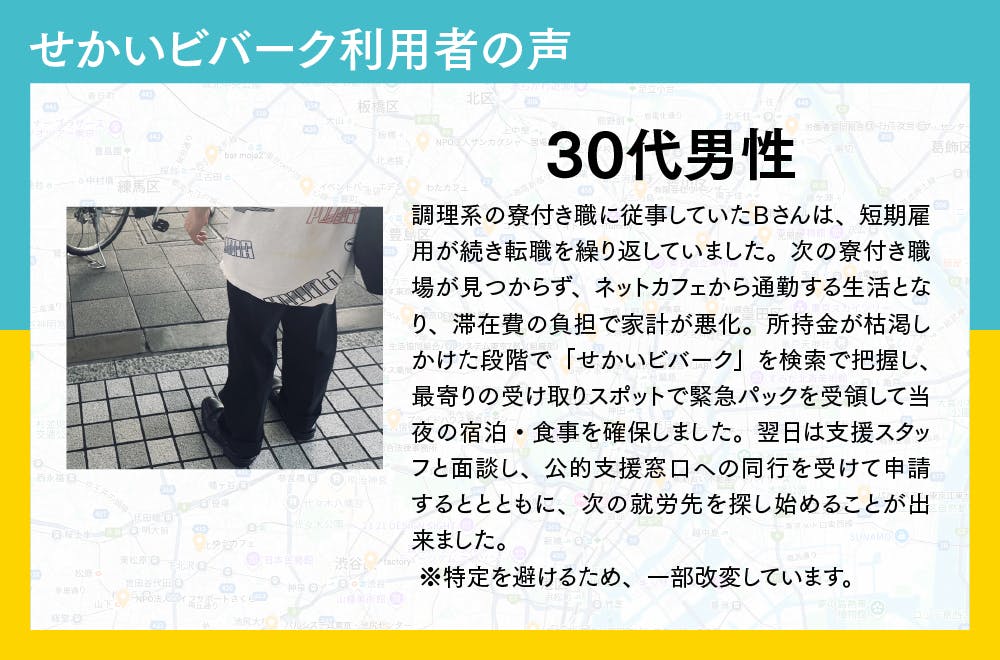 お越しいただいた方には、「せかいビバーク」と同様のワンストップ支援を行い、必要に応じて正月明け以降も、長期的な伴走支援を続けていきます。臨時相談会の詳細はこちらをクリック。