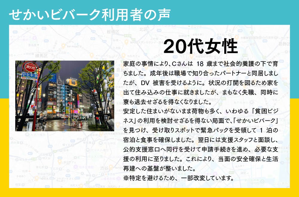 「せかいビバーク」自体ですでに56の法人・団体に受け取りスポットとして協力いただき、またそこから先も、連携団体や専門職、公的支援につなぐ人たちと一緒に命の元へ駆けつける支援を続けています。
