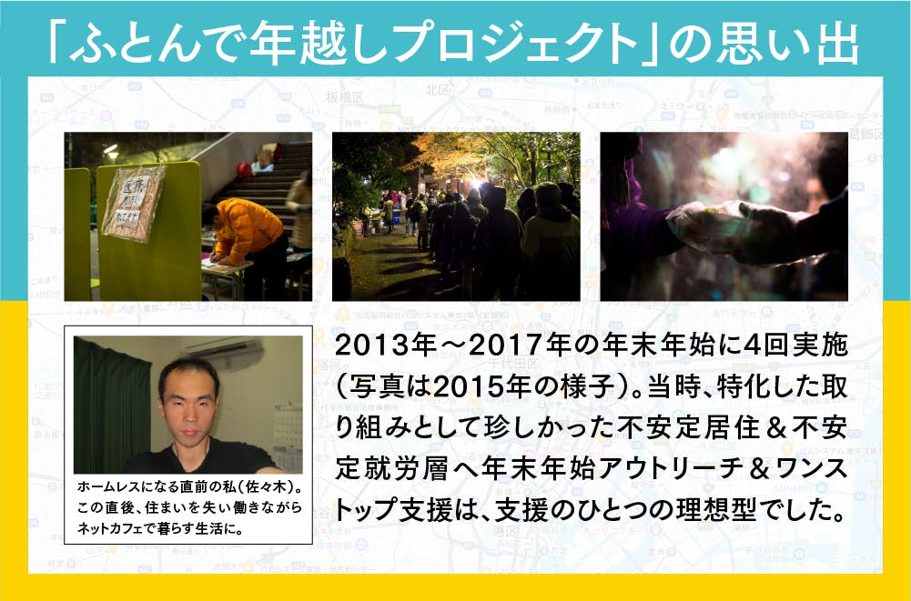 その後ご縁があって、その支援NPOで働くことになり、最初に関わらせていただいたのが「ふとんで年越しプロジェクト(略称『ふとんP』)」という取り組みでした。年末年始の閉庁期間のみですが、まだ十分に可視化されていなかった同じような立場の人たちに焦点を当て、複数の団体が連携し、宿泊支援を入り口に生活も医療もワンストップで支えるという、当時としては画期的な体制でした。