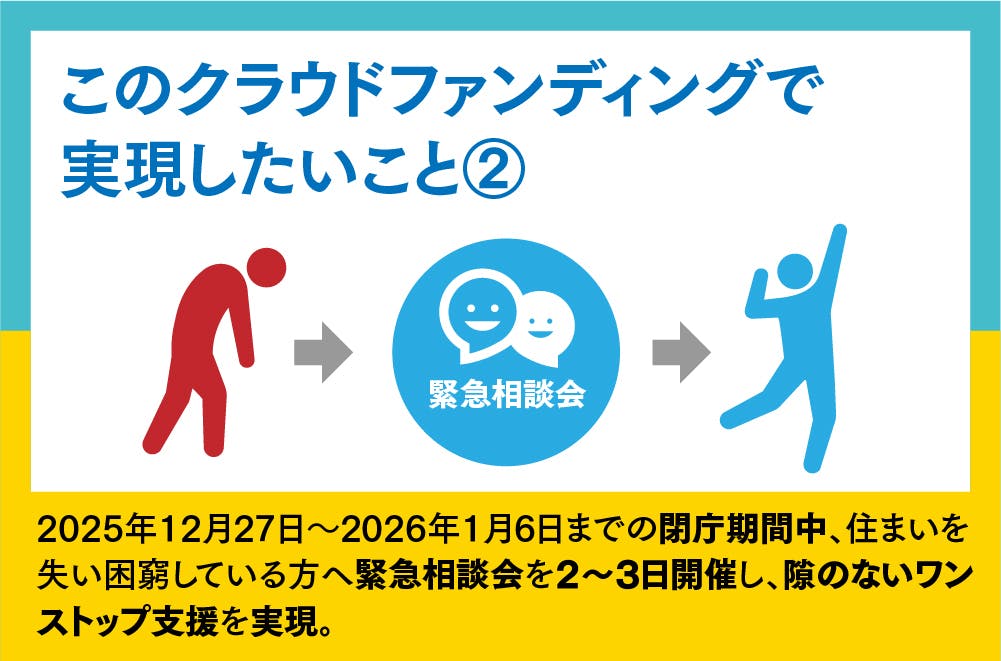 今回のクラウドファンディングのふたつめの目的は、この年末年始の臨時相談会を実施するための費用をご支援いただきたい、というお願いです。