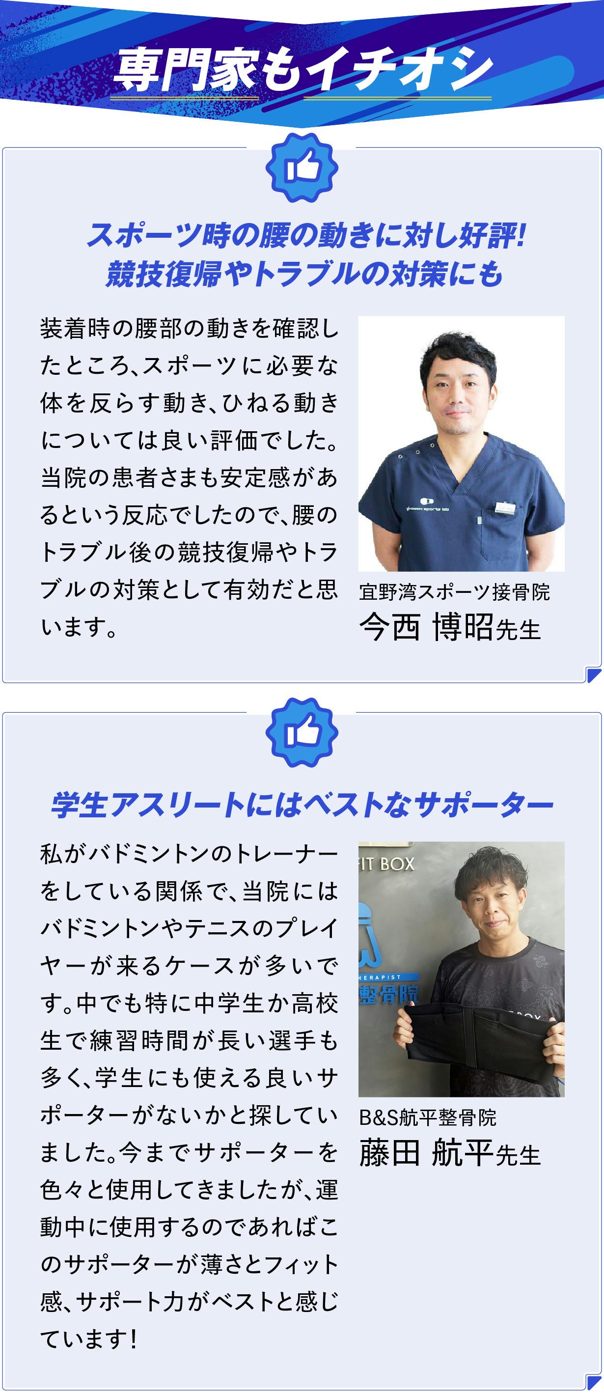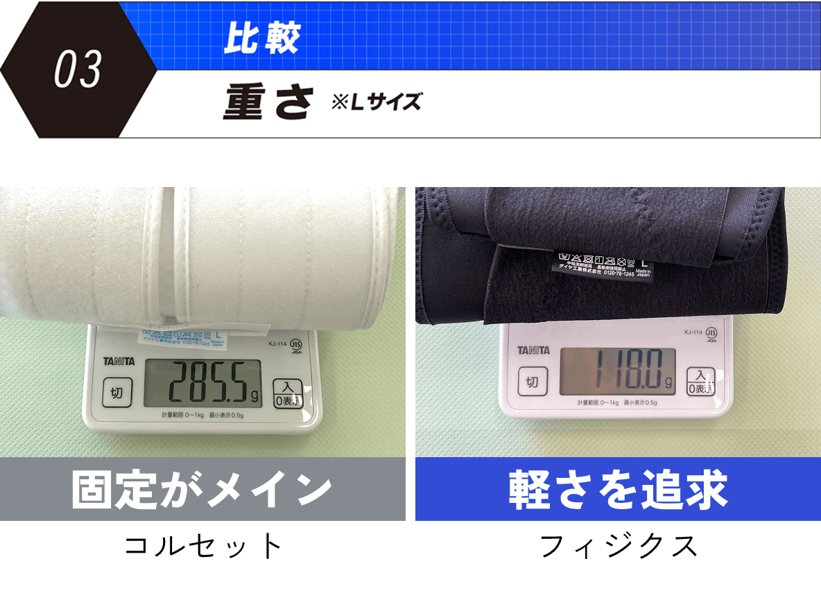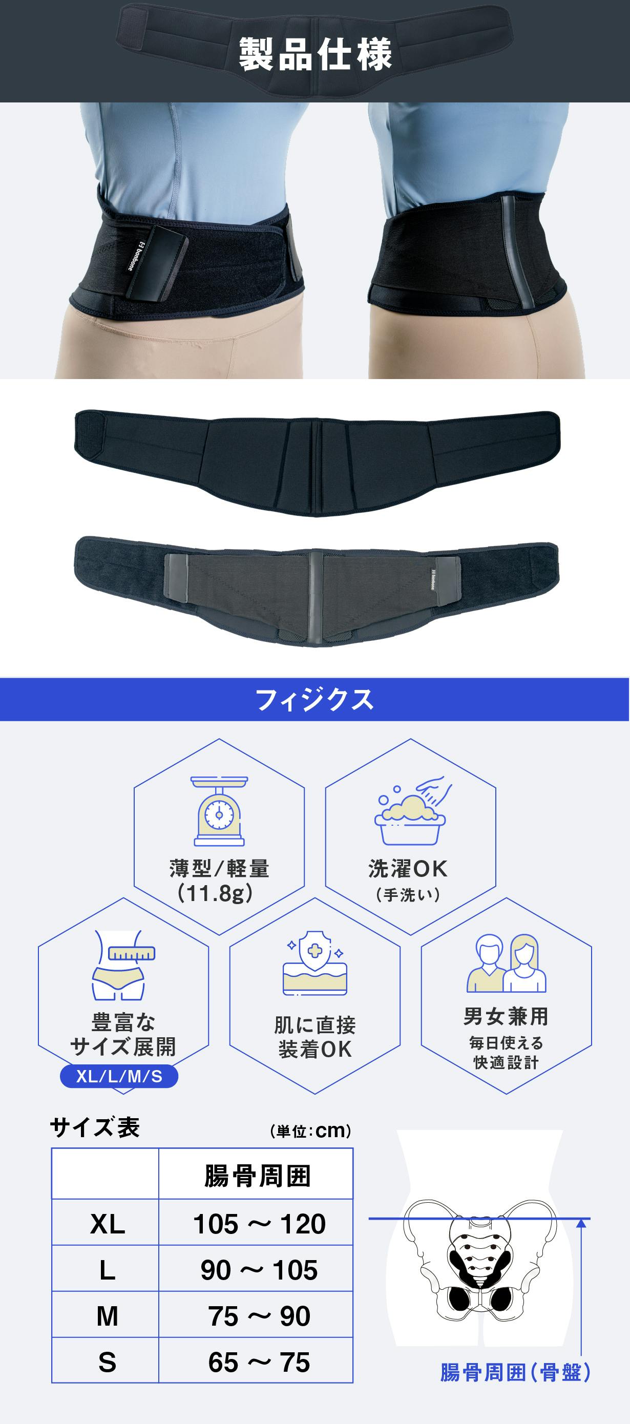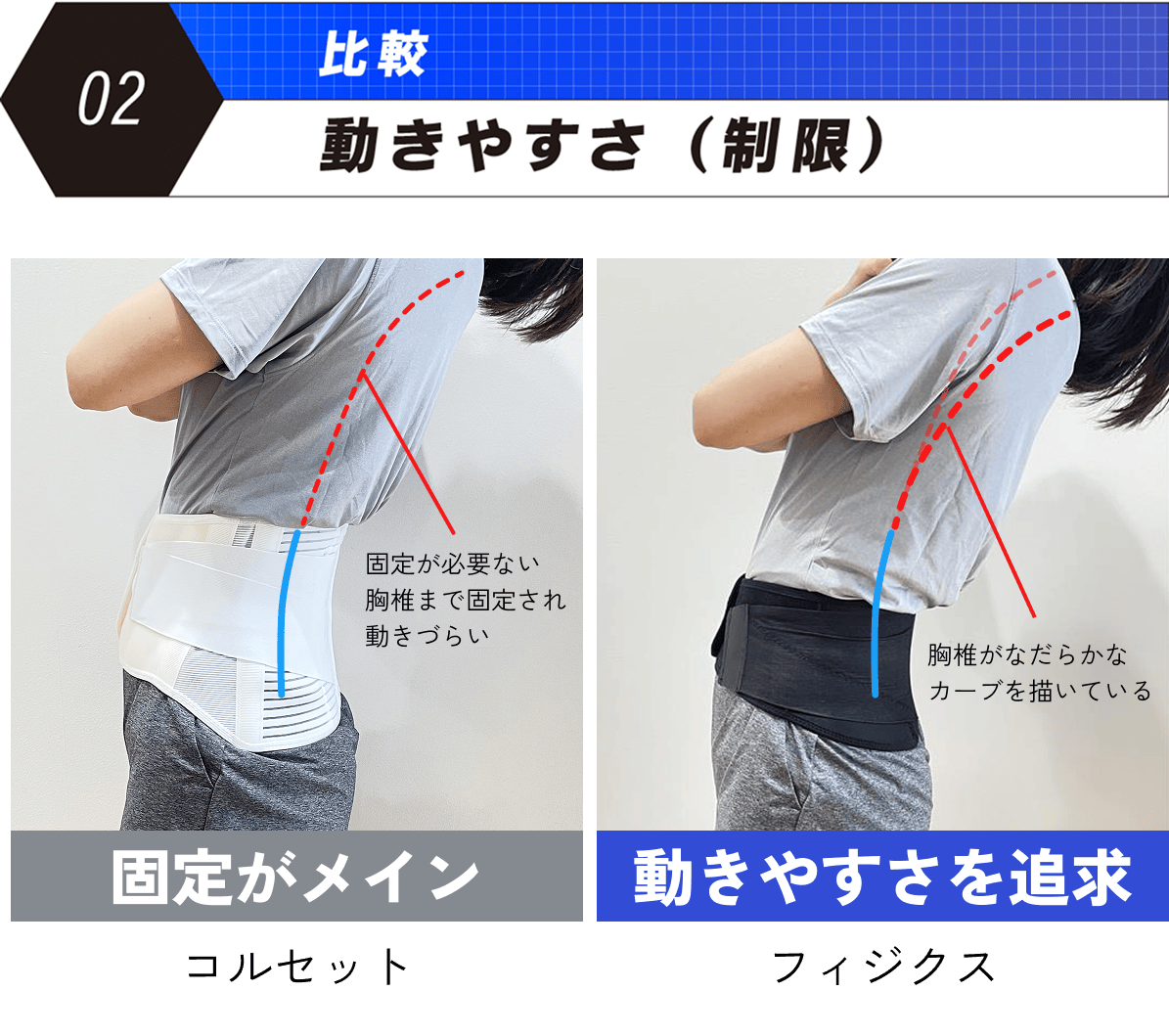 フィジクス(本製品)は腰椎をしっかりサポートしつつ、胸椎や股関節をフリーにし、「腰に負担がかかりにくい動き」を意識づけることができます。