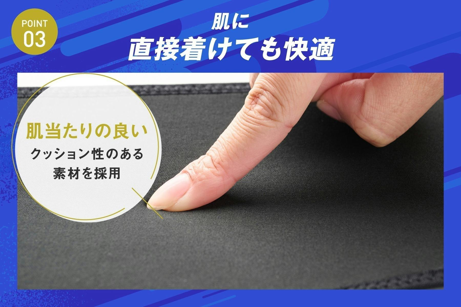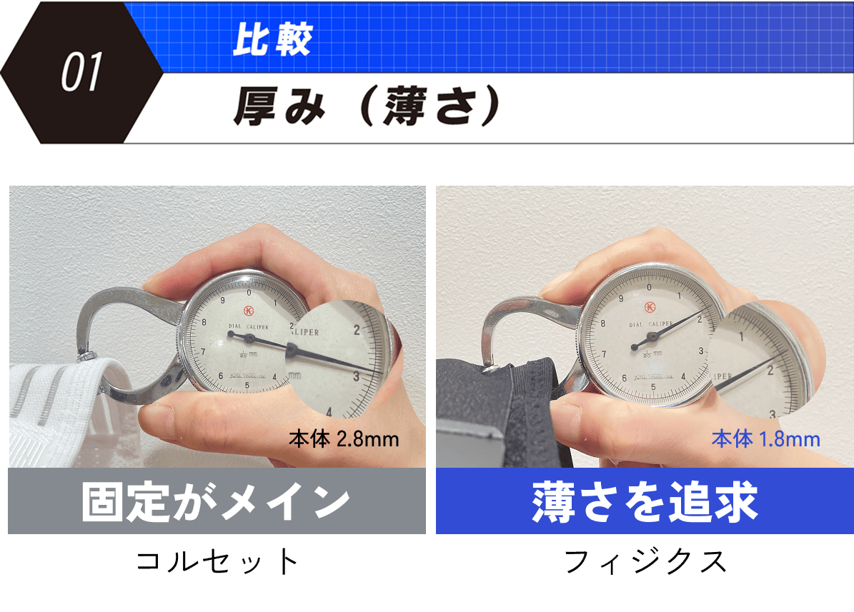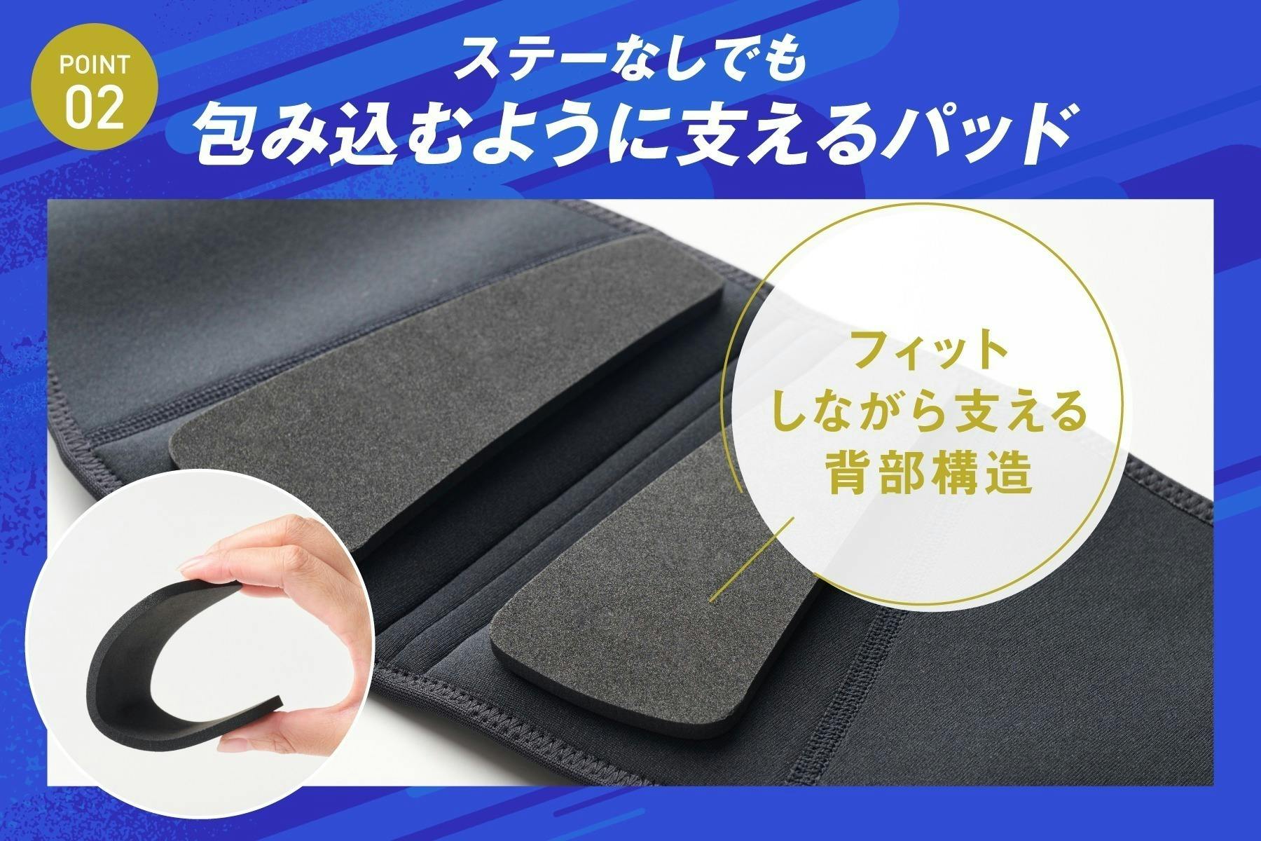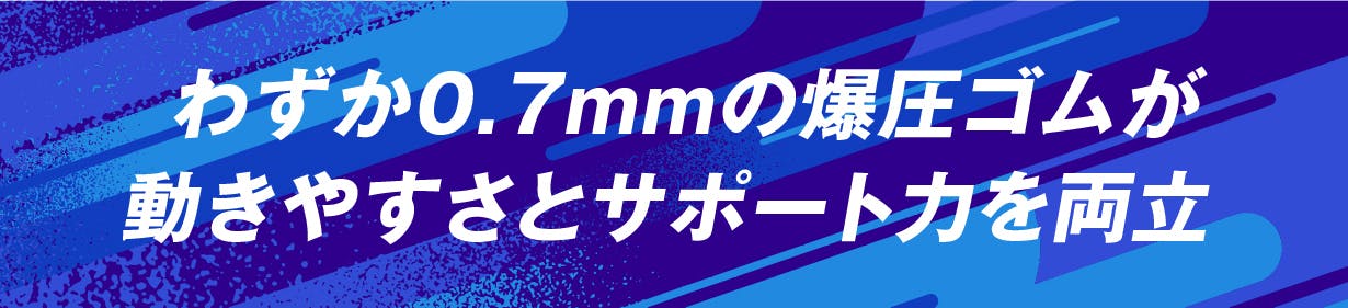 プレーに集中できるように、本体の薄さにはとことんこだわりました。補助ベルト(ゴム)は、薄いのにしっかり圧迫がかかる素材を採用。