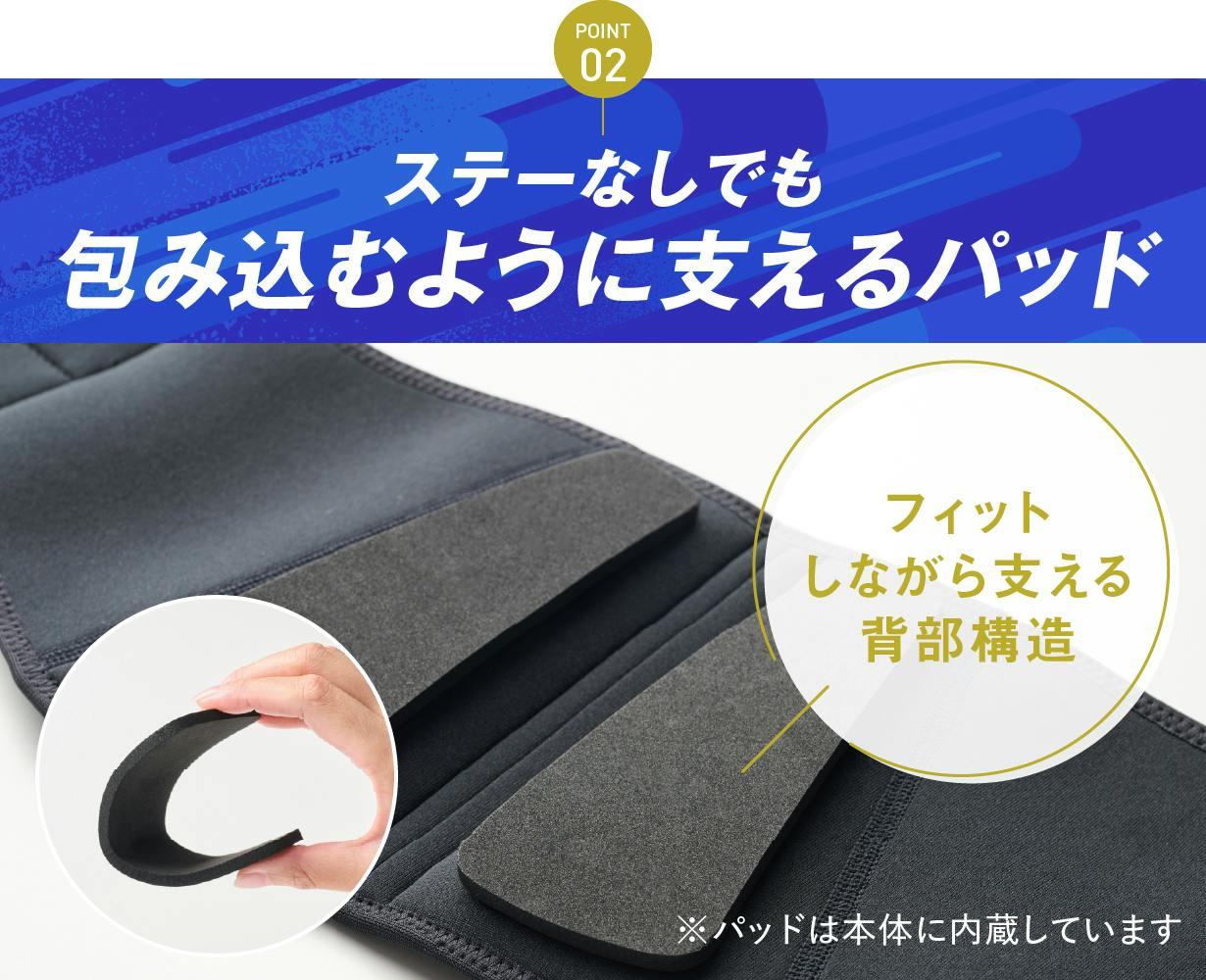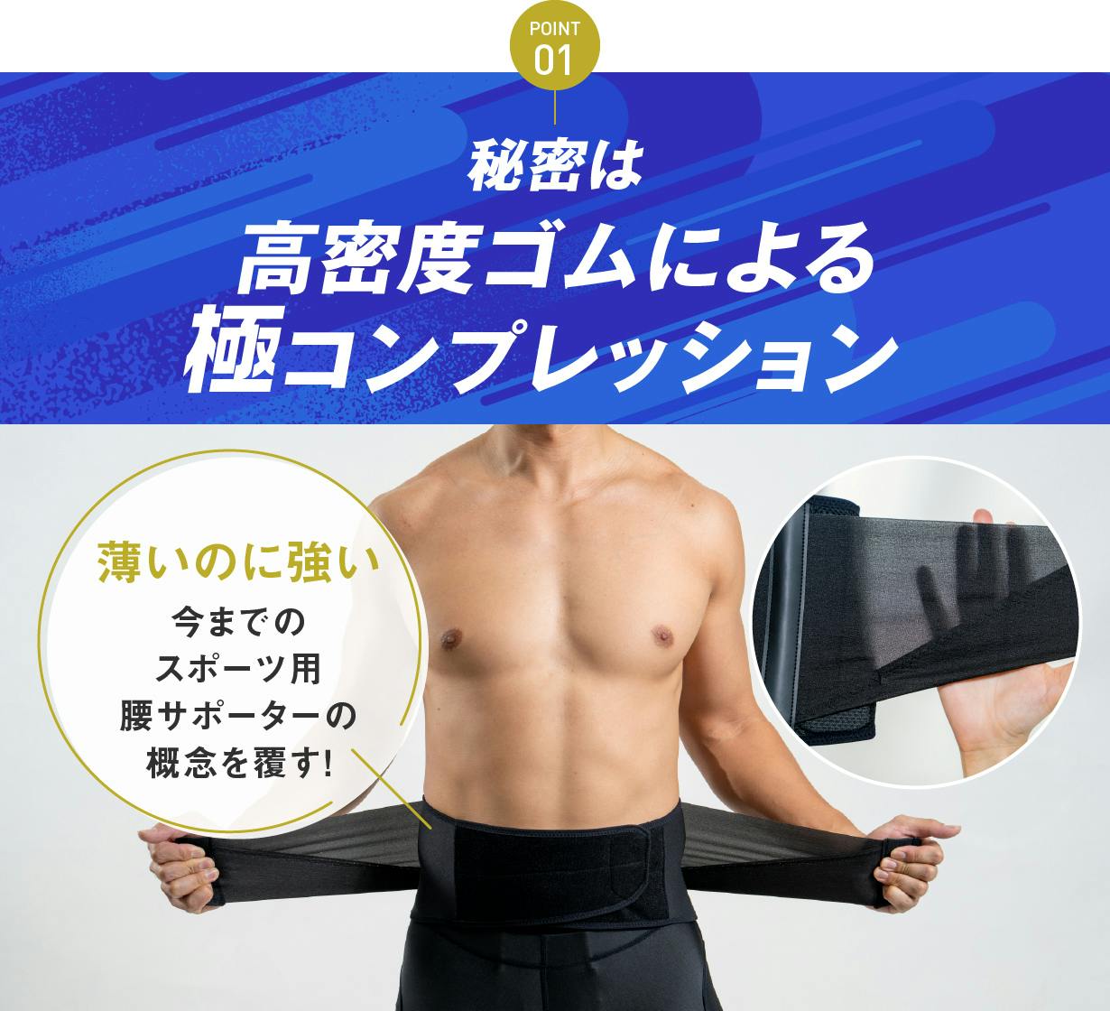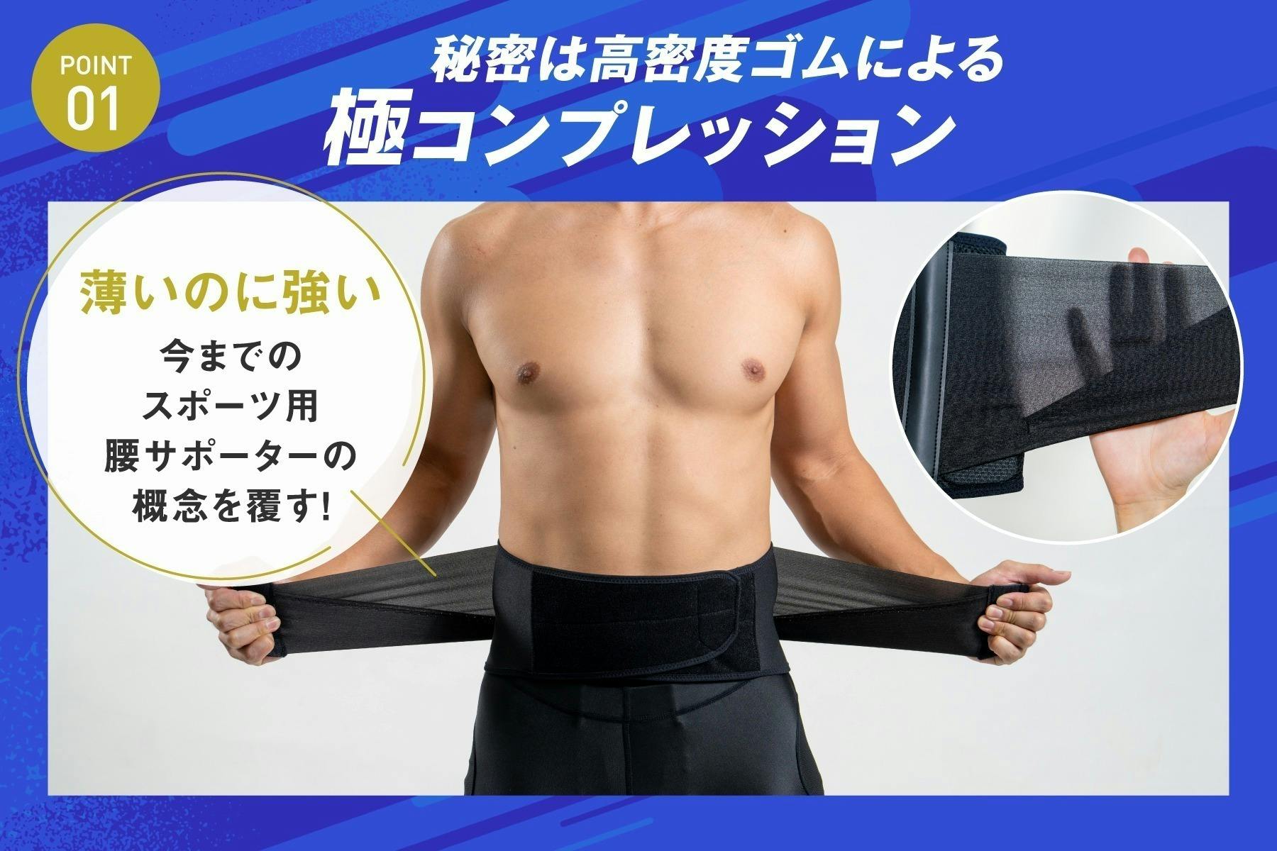 腰を圧迫する力が強い薄手生地を補助ベルトに採用。薄いので装着中の違和感が少なく、動きやすいのに腰をサポートする力が強い、スポーツ用腰サポーター。
