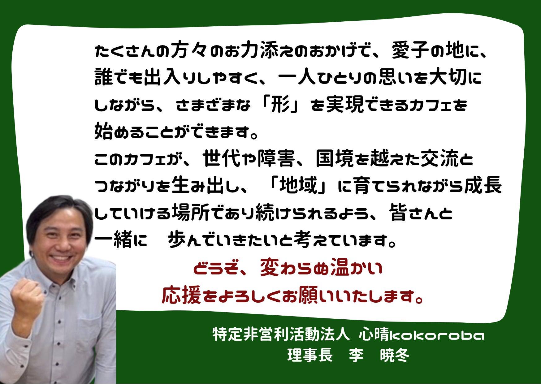 このカフェが多くの方々にとっての「居場所」となって、日常に溶け込んでいく。そして地域全体のつながりを深める場になることを心から願っています。