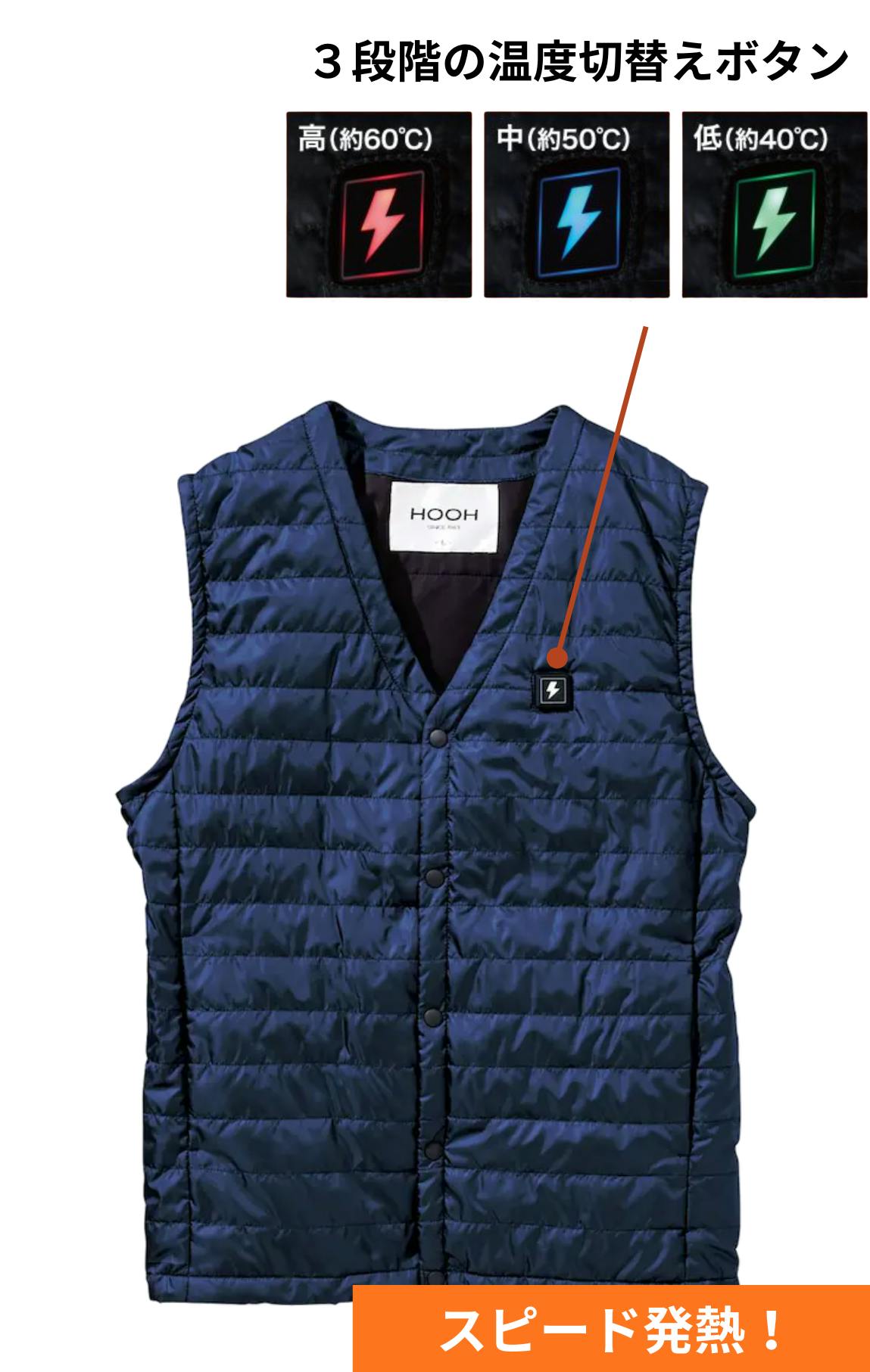 胸ボタンでさっと温度切替、スイッチオンから10秒で発熱し、温度は約40℃以上!速暖で着た瞬間から暖かさを感じることが出来ます。