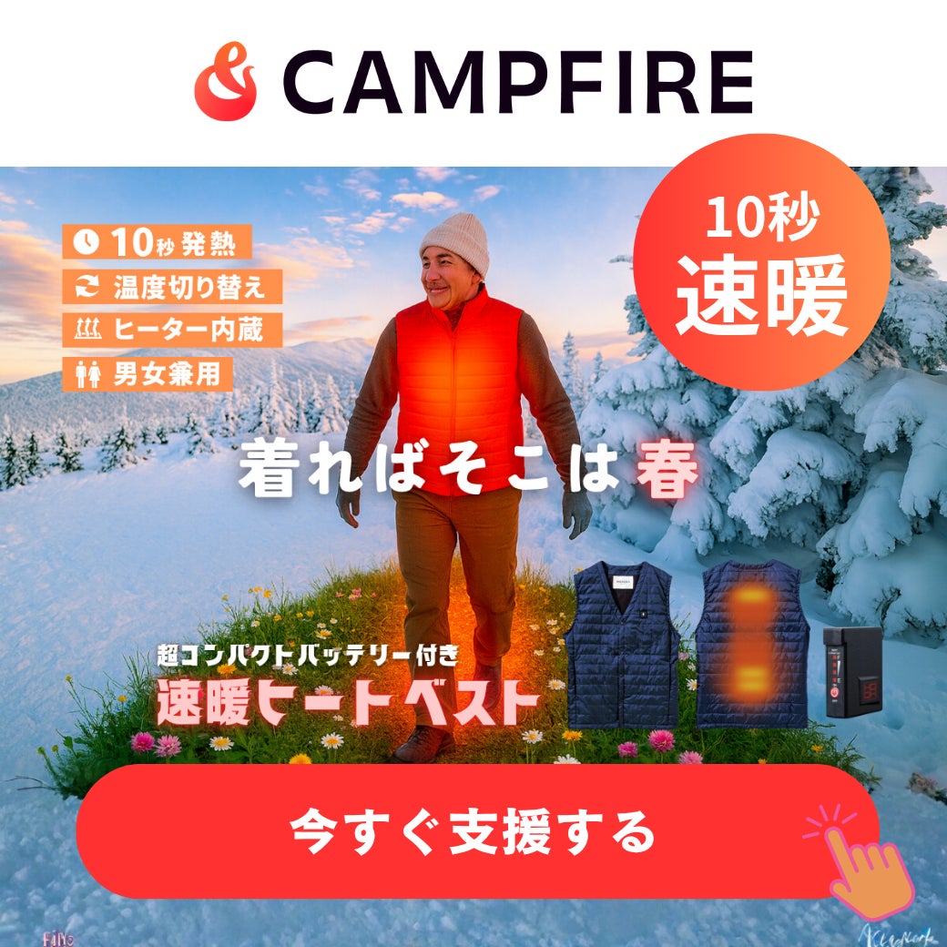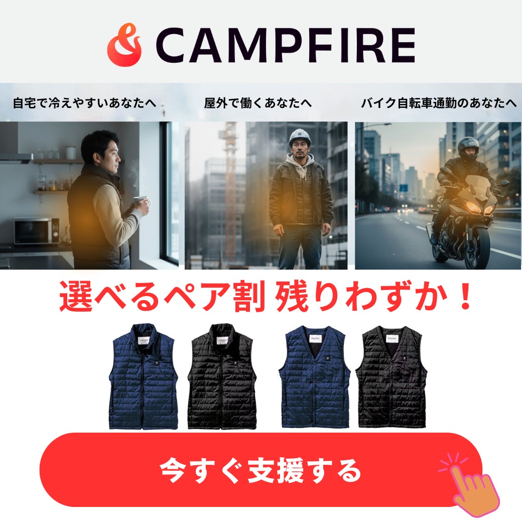 いつもありがとうございます!ヒートベストクラウドファンディング、あなたの使うシーンに合わせて“想像以上の反響”をいただいています。■ 自宅で冷えやすいあなたへ 暖房の効き待ち、もう不要です。着た瞬間から一気にポカポカ朝の寒さがガラッと変わります。■ 屋外で働くあなたへ 外気に負けない“芯まで届く暖かさ”。動けて、暖まって、頼れる。寒さが厳しい現場ほど違いが出ます!■ バイク・自転車通勤のあなたへ 走行風の冷たさをしっかりブロック。温度切替もワンタッチで快適。そして今、特に 選べるペア割 が爆発的な人気で、本当に残りわずかです。“通勤用+作業用”“あなた+家族”など、使い分けにも大好評。2着セットで9,980円!寒波が来る前に、ぜひお早めにご確認ください。後半はさらに混み合う見込みです。▼プロジェクトページhttps://camp-fire.jp/projects/893388/view