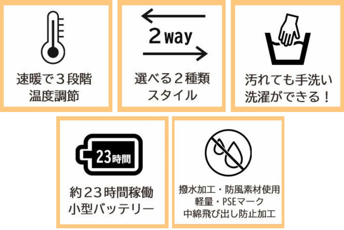 スイッチを入れてわずか10秒でぽかぽか。手のひらサイズの小型バッテリーで約23時間稼働!