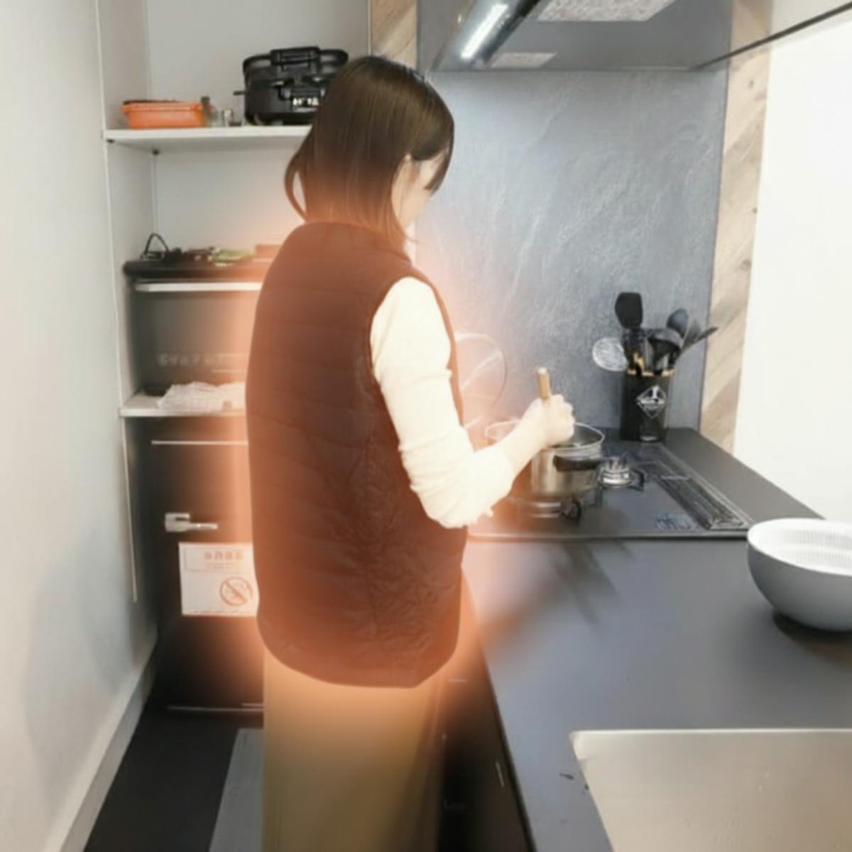 身体を直接温めるから暖房をつけなくても快適に家事ができます。