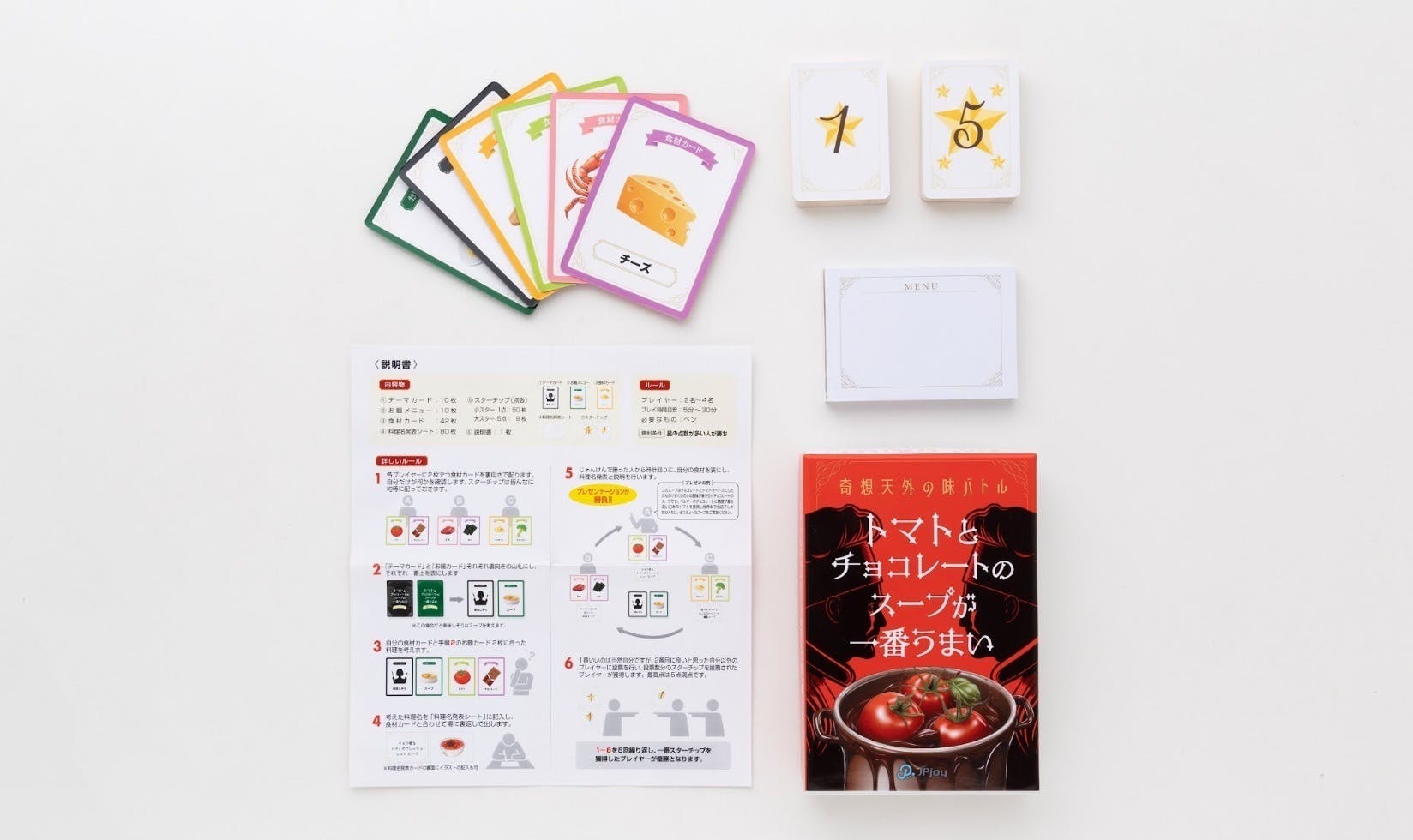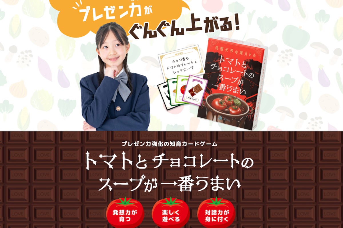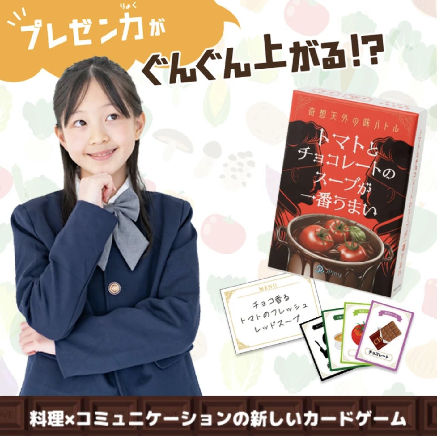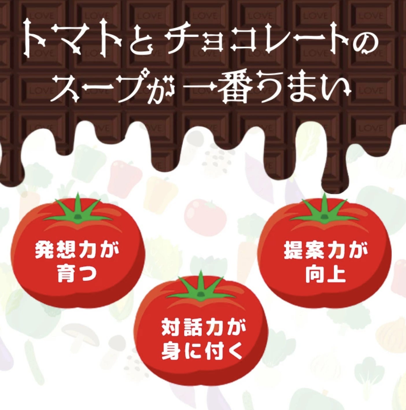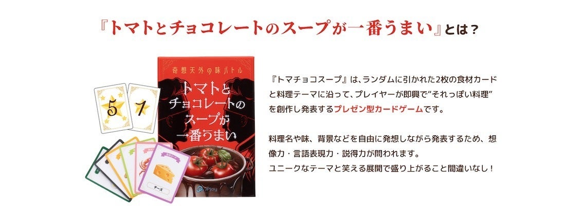 このカードゲーム「トマトとチョコレートのスープが一番うまい」には、はっきりとした正解はありません。カードの組み合わせから生まれるユニークなお題に対して、プレイヤーは 自分のアイデアを言葉にして発表し、相手を楽しませたり納得させたりします。お子様たちが「発想力」と「表現力」を育むことができれば幸いです。