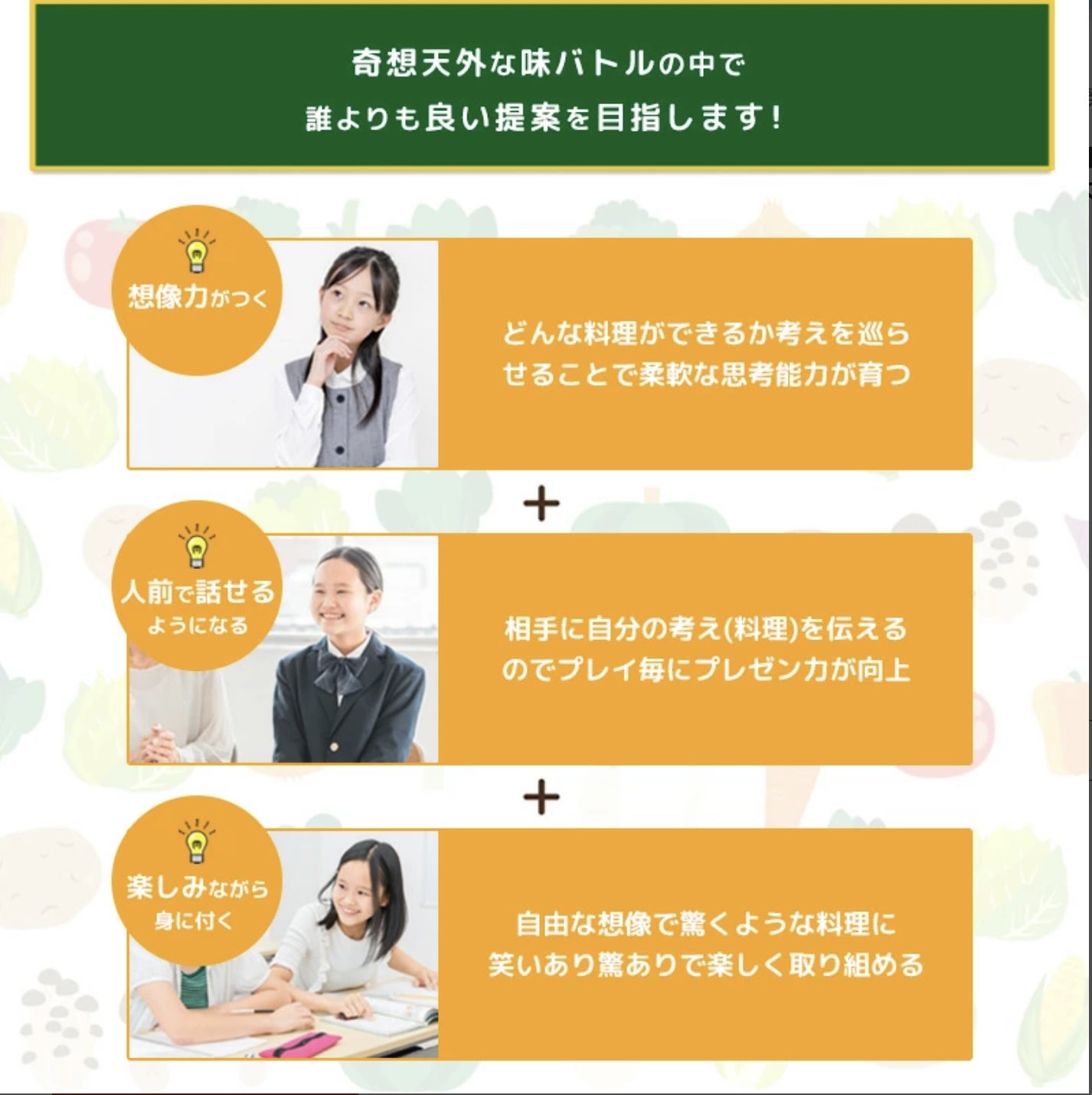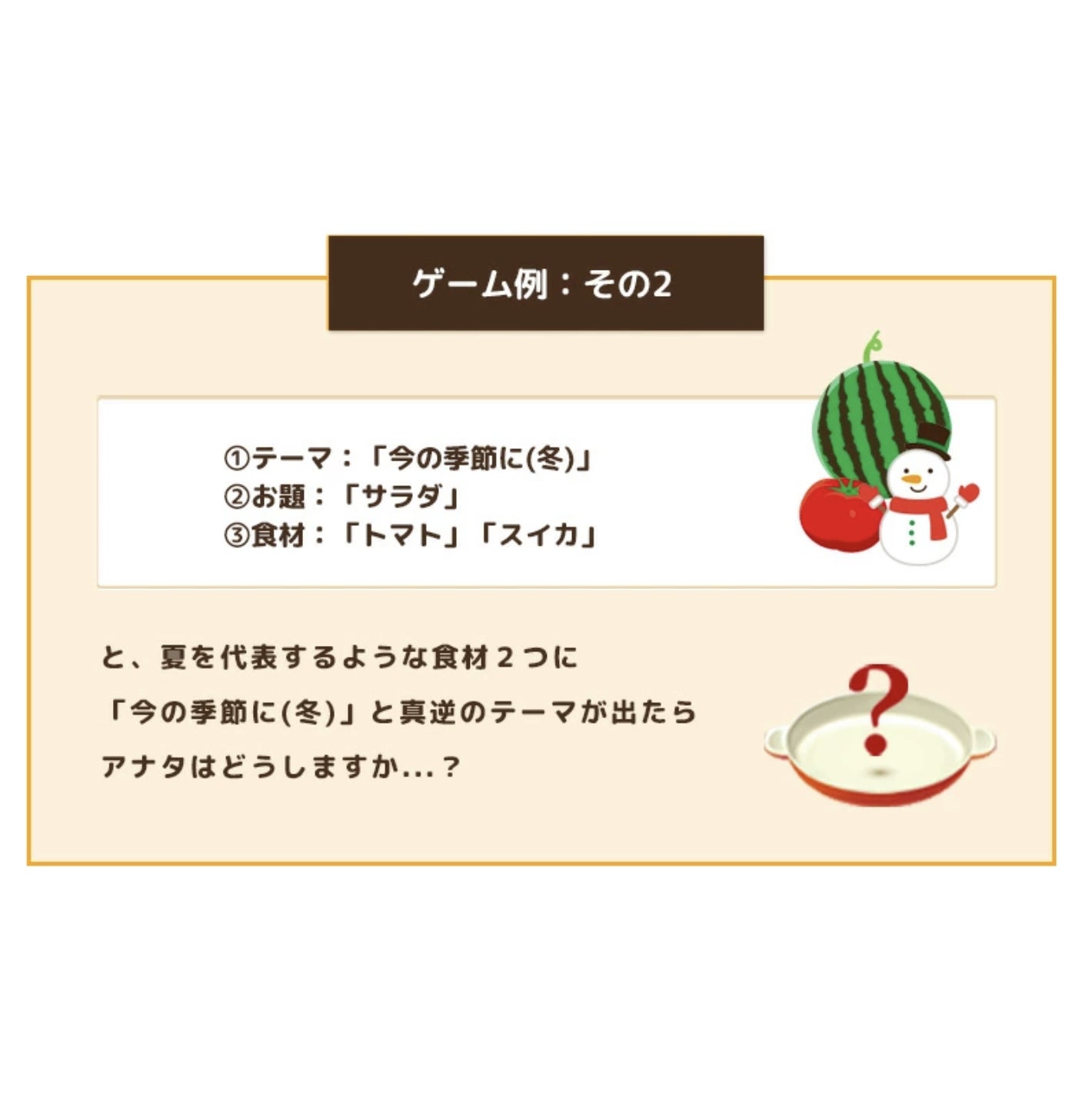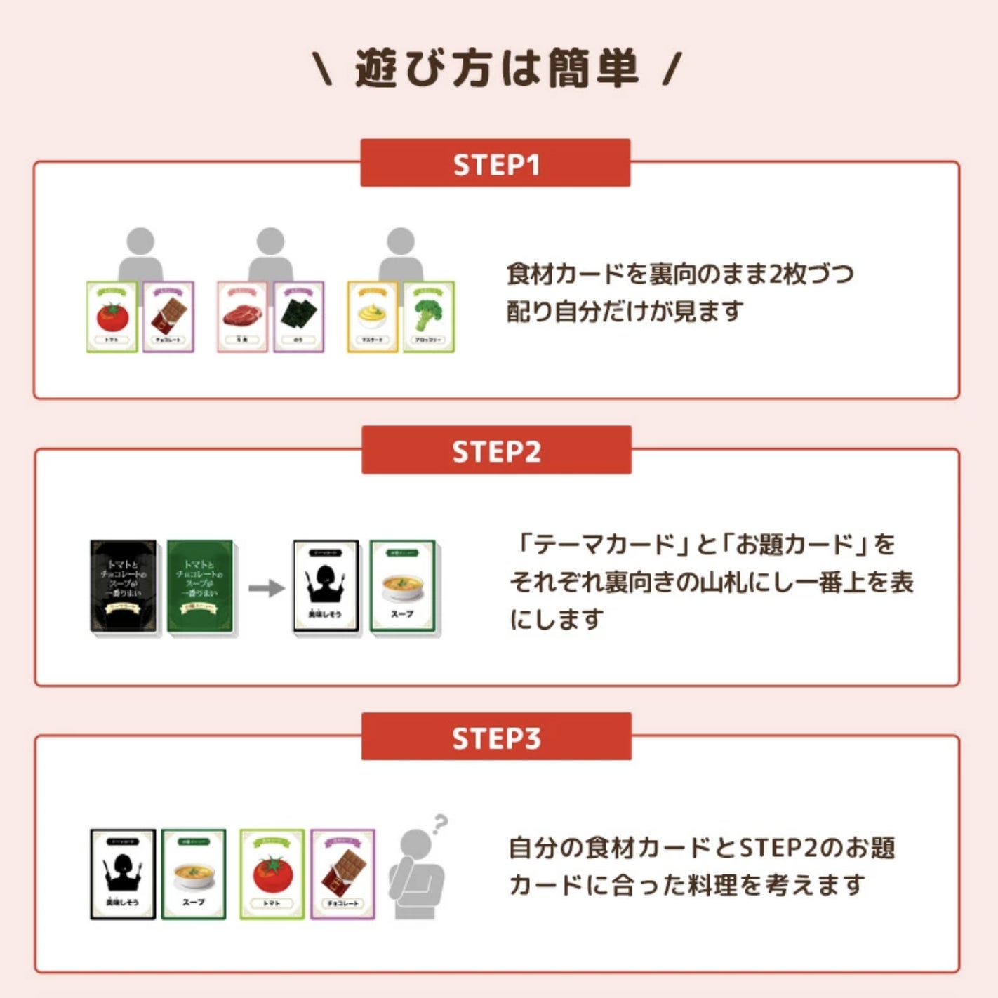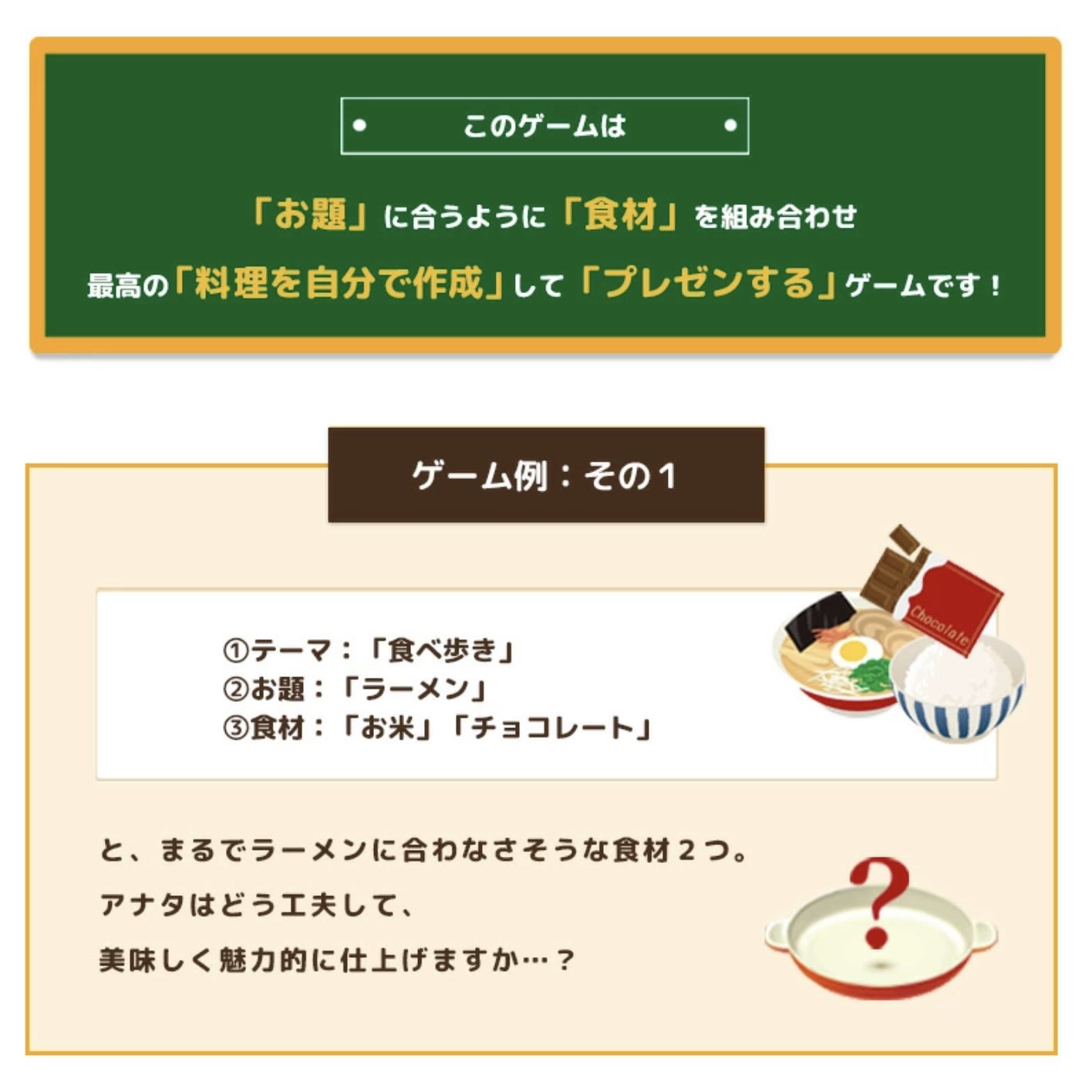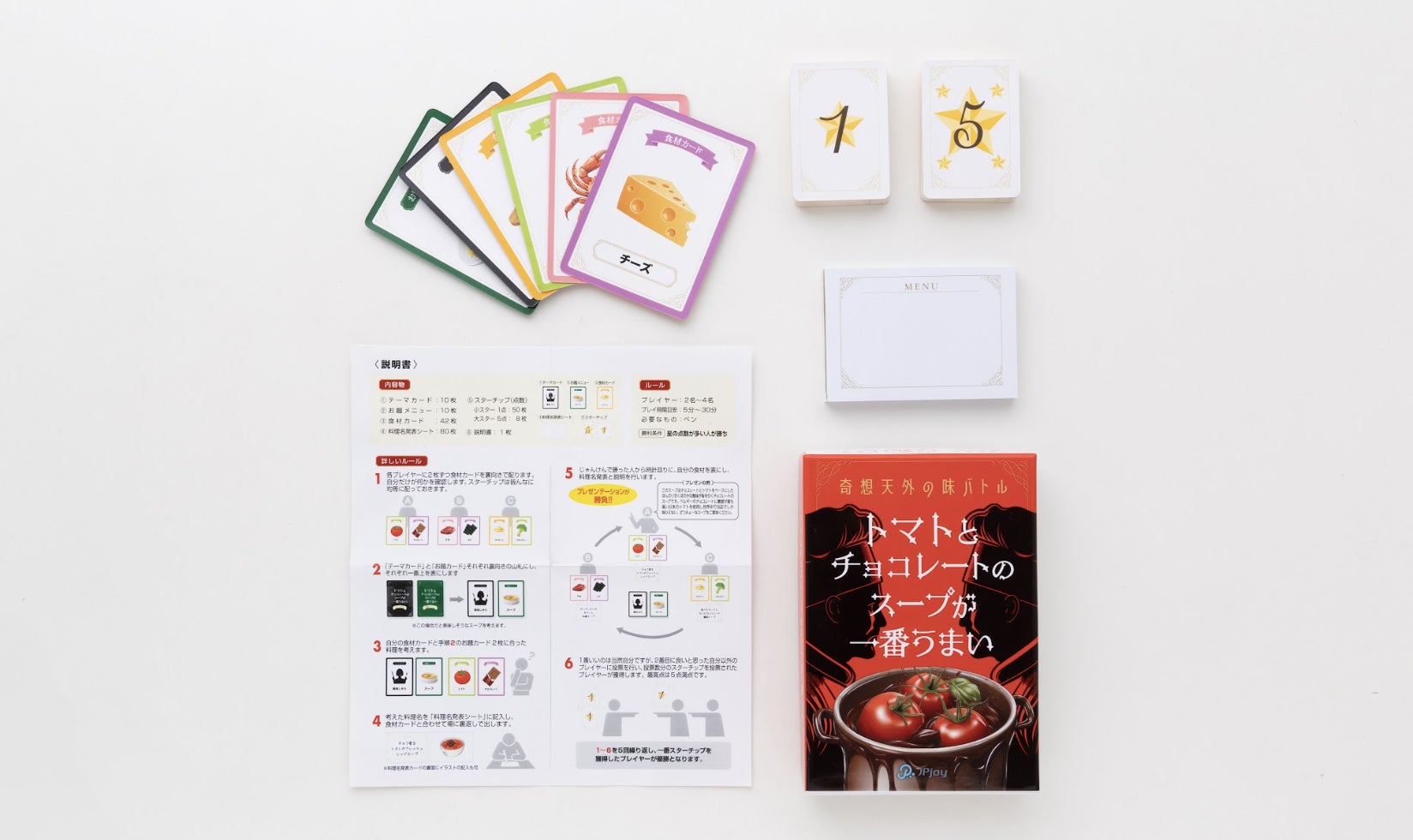 このカードゲーム「トマトとチョコレートのスープが一番うまい」には、はっきりとした正解はありません。カードの組み合わせから生まれるユニークなお題に対して、プレイヤーは 自分のアイデアを言葉にして発表し、相手を楽しませたり納得させたりします。お子様たちが「発想力」と「表現力」を育むことができれば幸いです。