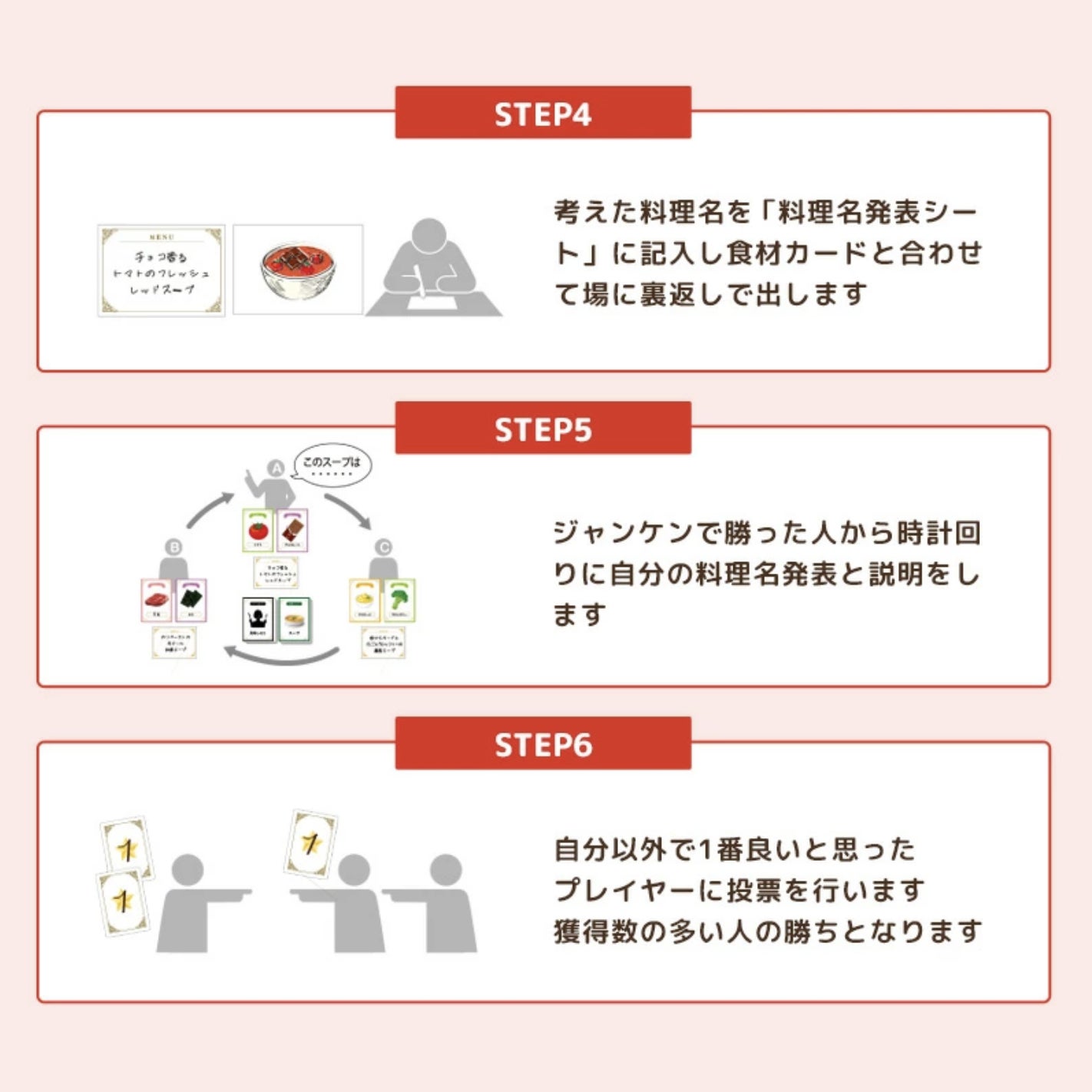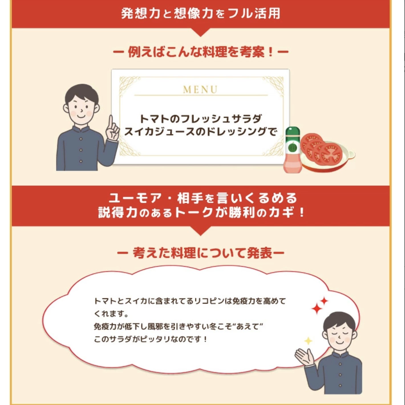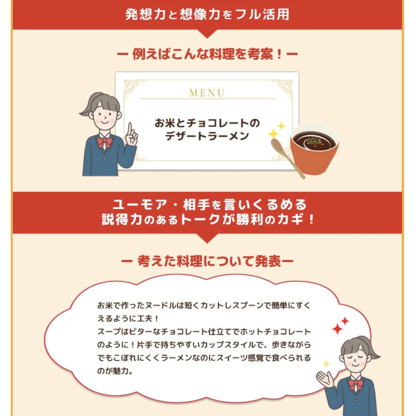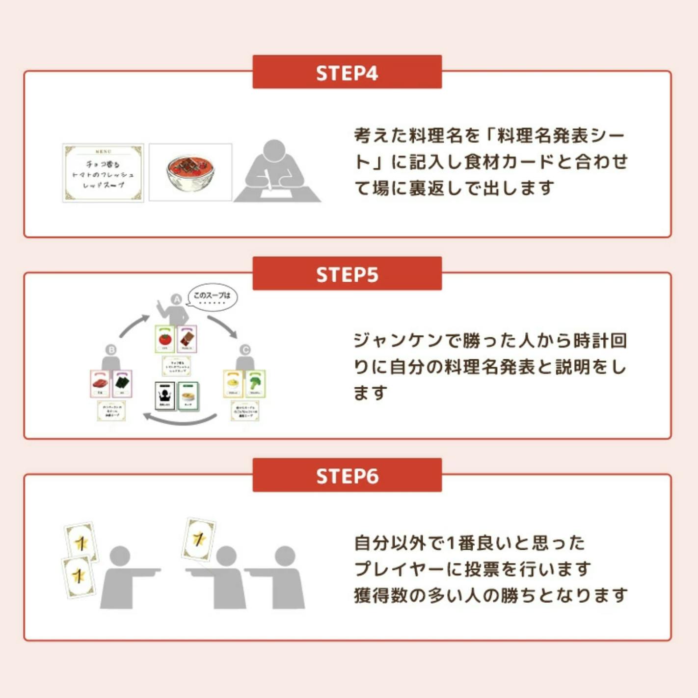 このカードゲーム「トマトとチョコレートのスープが一番うまい」には、はっきりとした正解はありません。カードの組み合わせから生まれるユニークなお題に対して、プレイヤーは 自分のアイデアを言葉にして発表し、相手を楽しませたり納得させたりします。お子様たちが「発想力」と「表現力」を育むことができれば幸いです。
