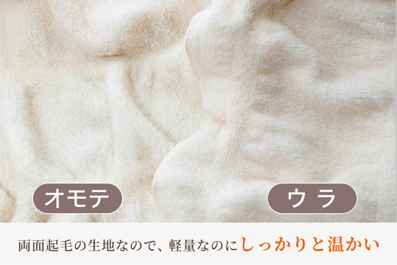 ハグウォームの生地は、表と裏でパイルの長さを変えており、表側はもこもこで暖かく、裏面はふんわりサラサラな両面パイルのため寒さや季節に合わせて使い分けができます。寒いときはパイルが長い表側を肌側に使うのがおすすめです。